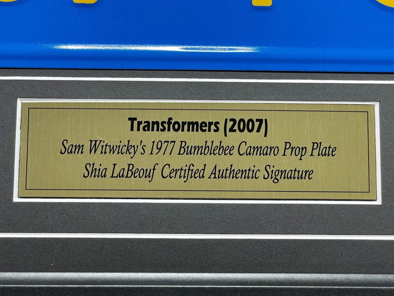Shia LaBeouf Autographed "Transformers" Framed Licensed Plate Collage!! This is a must-have for the man cave as this collage features a hand signed 11" x 14" photograph by Shia LaBeouf himself with an unsigned license plate from Sam Witwicky's car, the 1977 Bumblebee Camaro in the hit 2007 blockbuster film!! The replica metal license plate is a full-size stamped license plate you would see on any vehicle on the road and measures approx 12" x 6" in size. If you are a big fan of the iconic movies or specifically this "Movie Car", well then this item is for you!! Please note this license plate is not screen used just a replica of the one you would see in a movie!