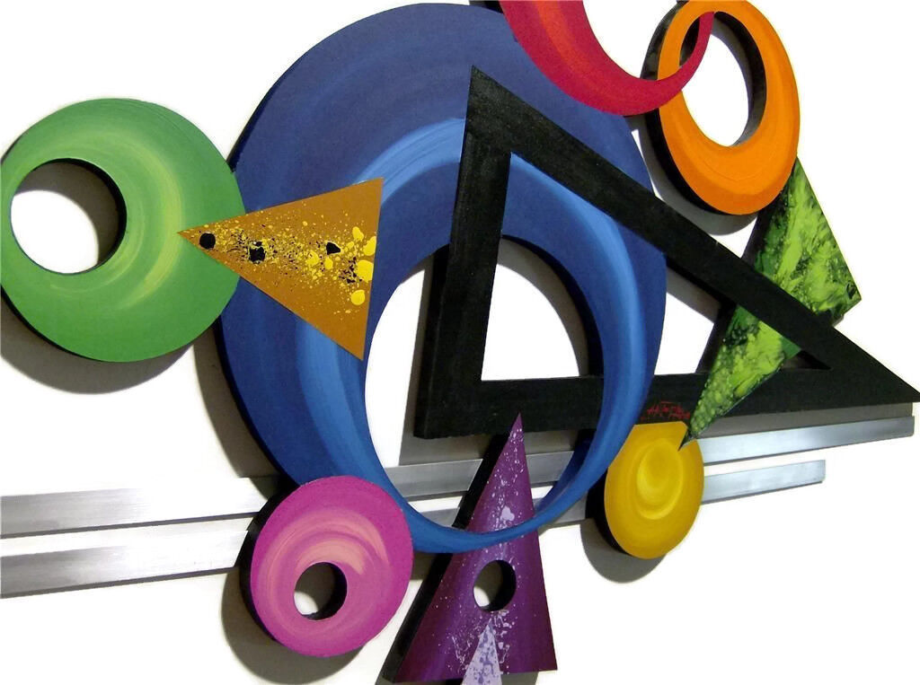 This original sculpture was designed cut from 1/2" wood. With a colorful display of geometric shapes abstract designs it features (2) 34" aluminum metal strips which are secured across the back of the sculpture with screws. (minor assembly upon arrival is required. holes are pre-drilled screws are included)
