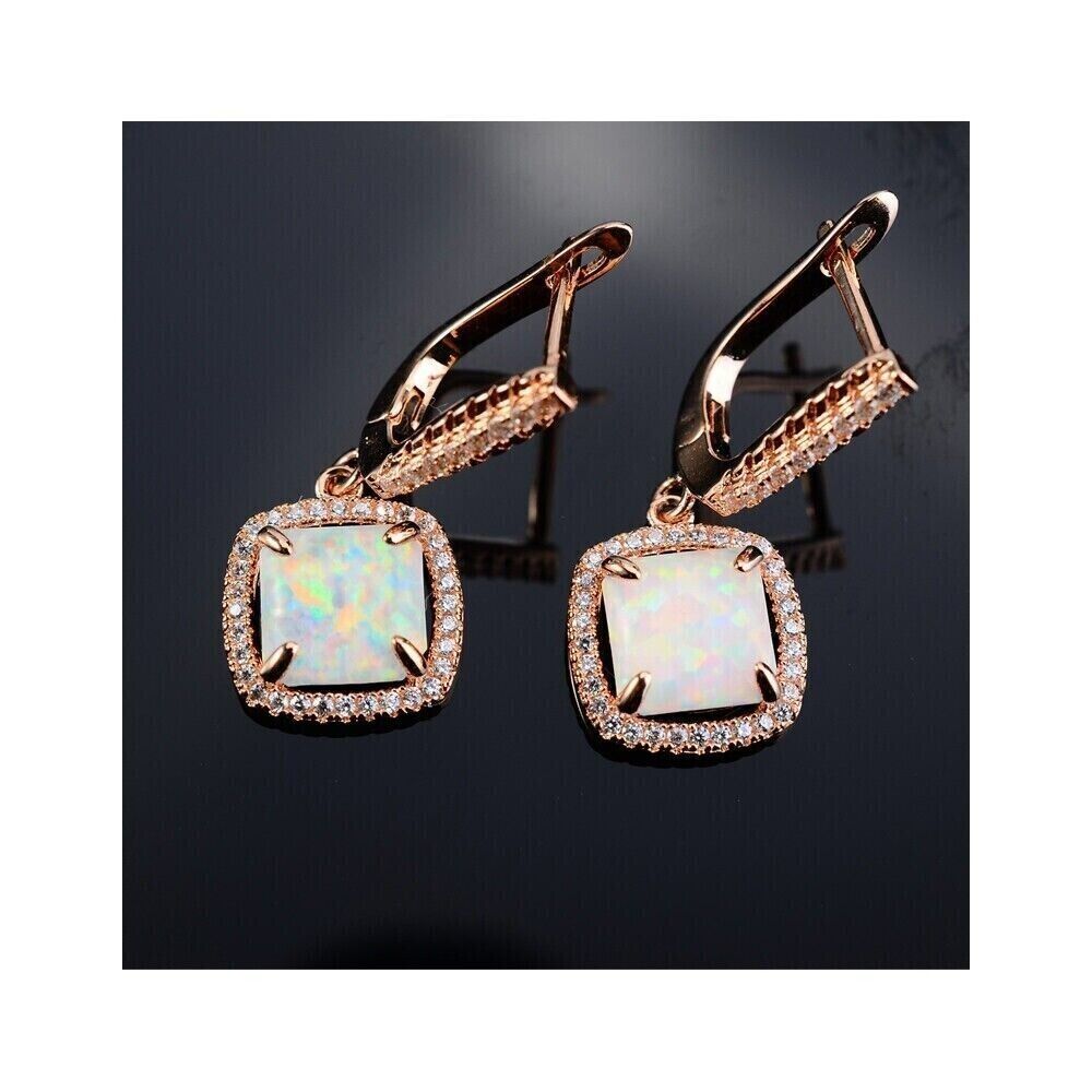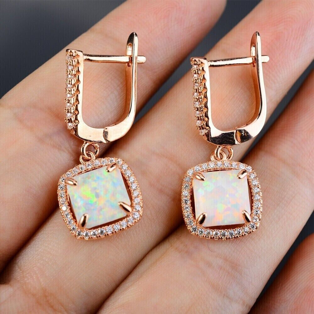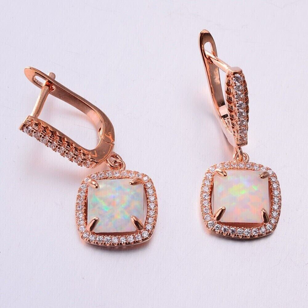 4Ct Princess Cut CZ Fire Opals Halo Drop Dangle Earrings 14k Rose Gold Plated