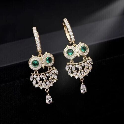 3Ct Round Cut CZ Green Emerald Drop Dangle Owl Earrings 14K Yellow Gold Plated