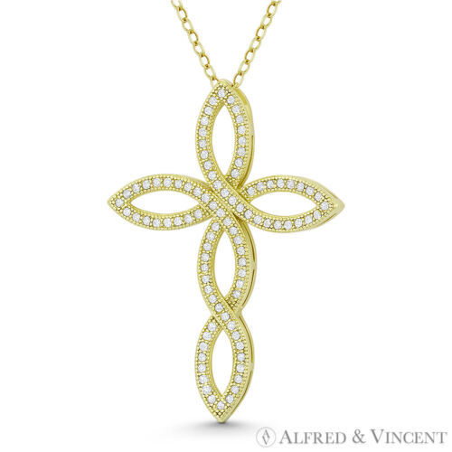 The featured pendant is cast in 14k yellow gold-plated .925 sterling silver and showcases a loop cross paved with cubic zirconia crystals then finished with a chain slot that will accommodate most average-sized chains.