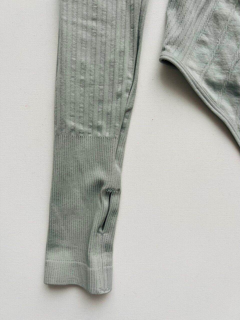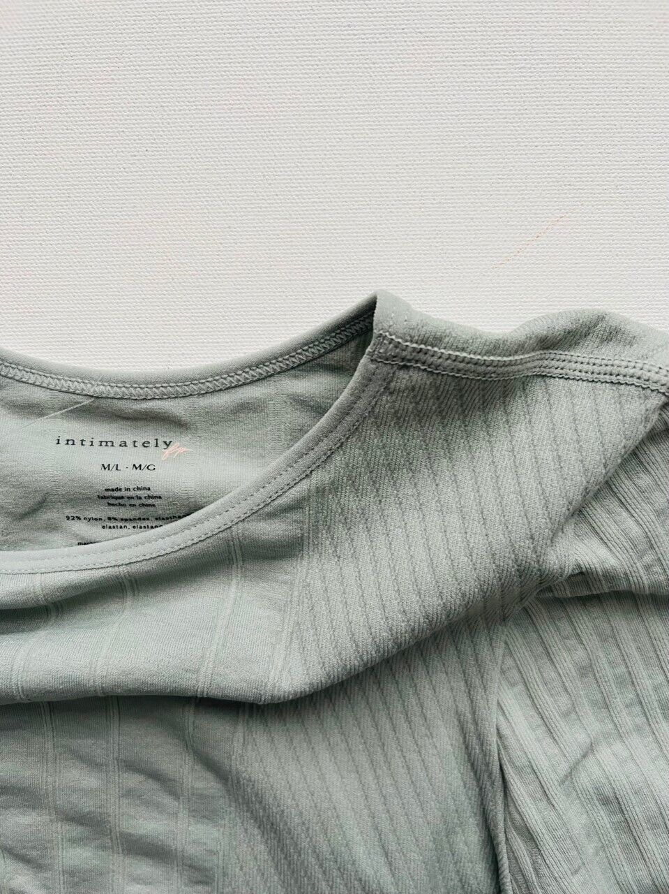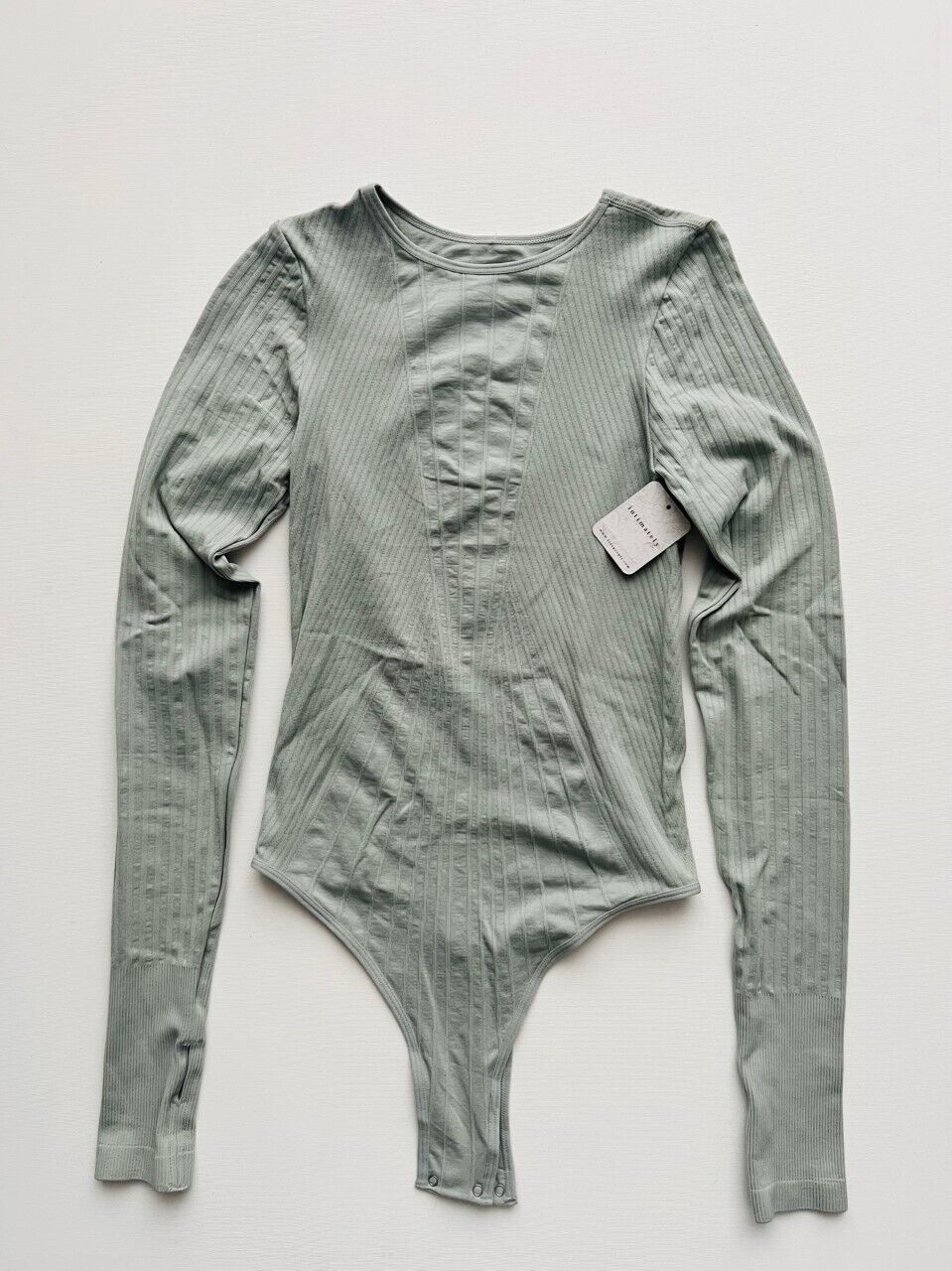 92% nylon, 8% spandex. Made in China. Machine wash. Gusset snap button closure with thong back. Thumbhole design. Stretch fit seamless design with ribbed detail.
