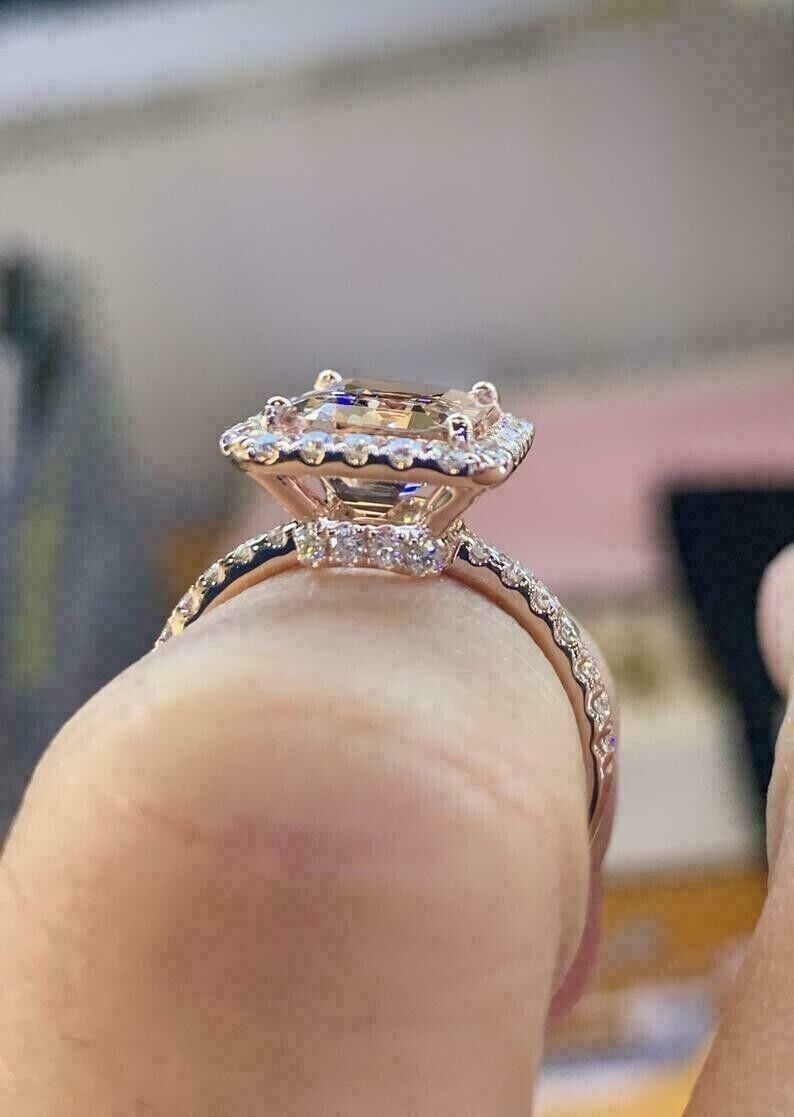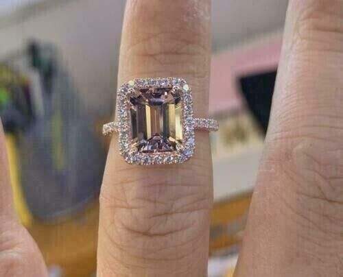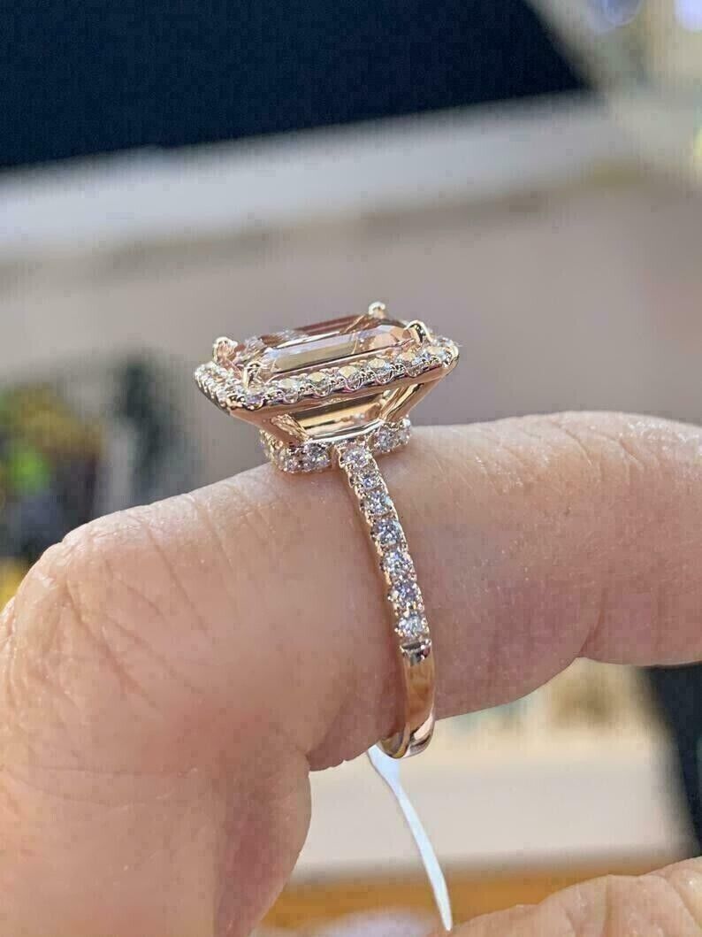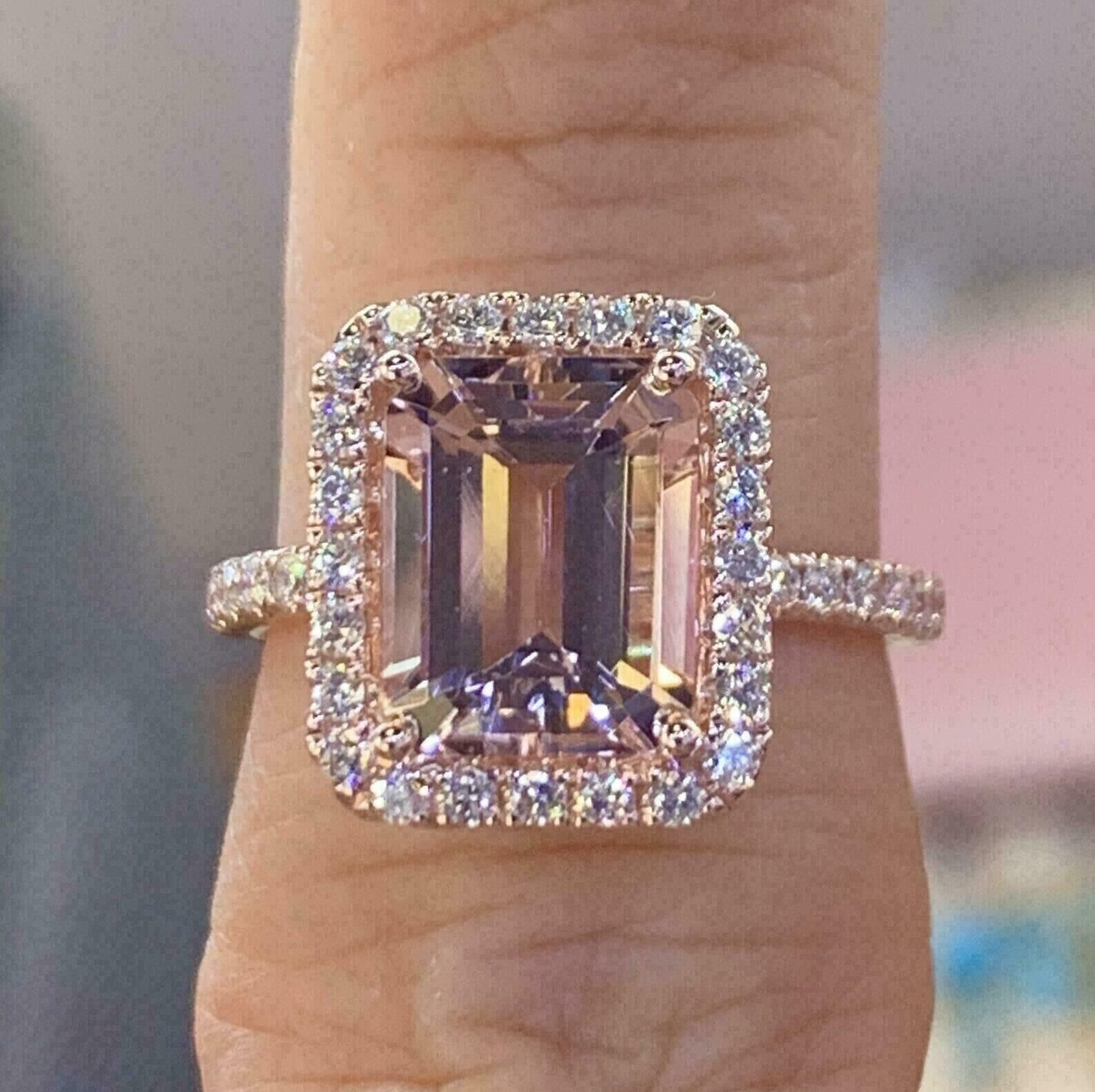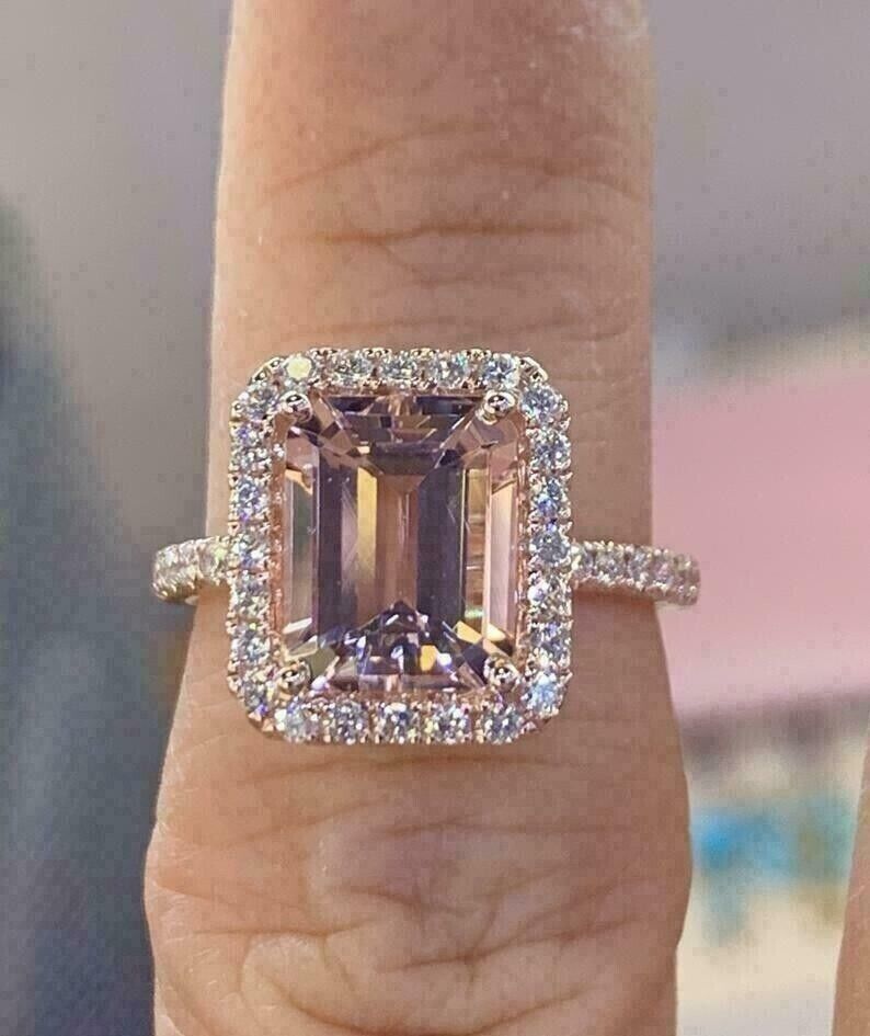 2.50Ct Emerald Cut CZ Morganite Halo Engagement Ring 14K Rose Gold Plated