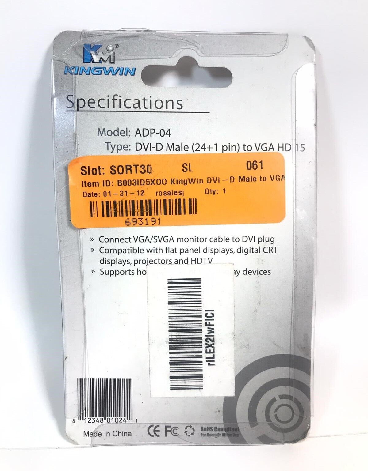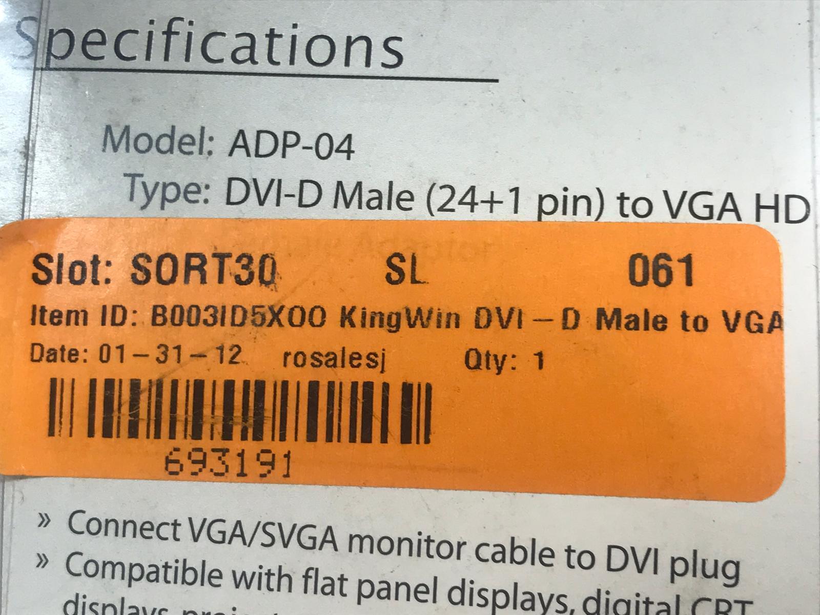 Kingwin ADP-04 DVI-D(M) To Vga(F) Adapter and 48 similar items