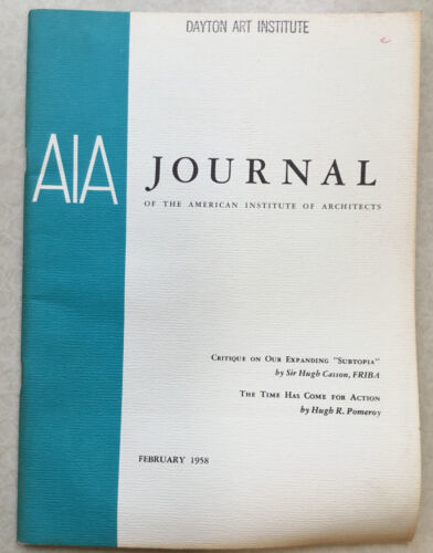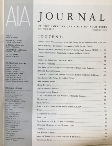 AIA Journal February 1958. Monthly publication of the American Institute of Architects. Ex-library in good condition. See pictures for table of contents. Feel free to email with questions. I do combine shipping on multiple purchases. Have a great day!