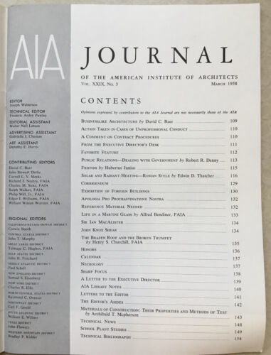 AIA Journal March 1958. Monthly publication of the American Institute of Architects. Ex-library in good condition. See pictures for table of contents. Feel free to email with questions. I do combine shipping on multiple purchases. Have a great day!