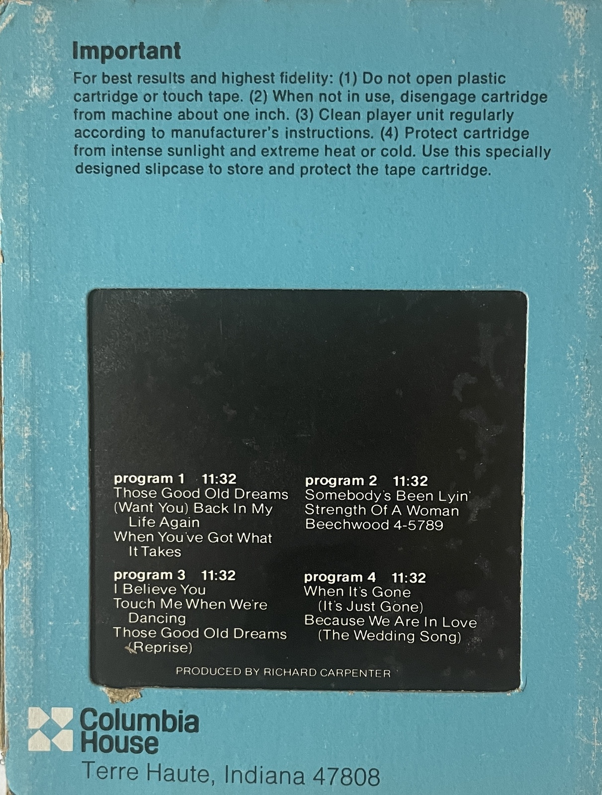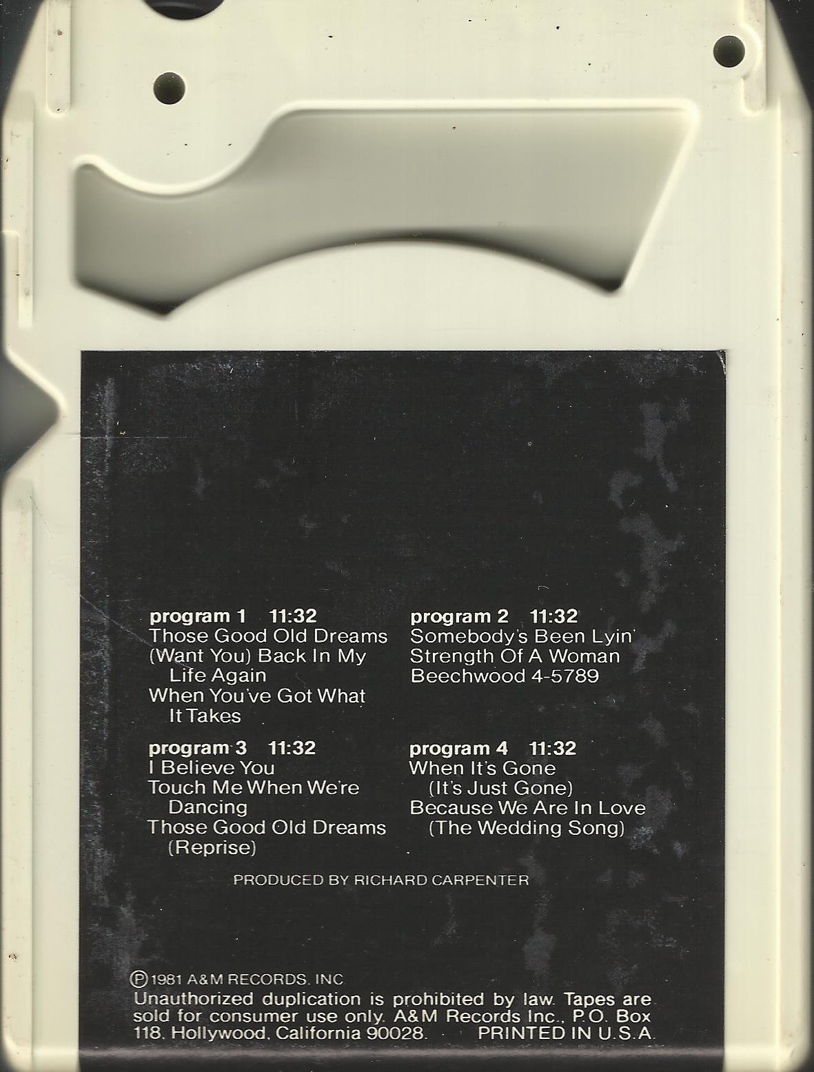 This 8-track is very clean...1981... 8-Track Listing This 8-track is in Very Good to Like New Condition....All 8-tracks are sold as nostalgic items....No refunds on 8-tracks... All 8-tracks are tested and work fine but depending on 8-track player there could be problems with playback. 8-tracks were not the most reliable source of music back in the day. Sold as Nostalgic Item Only! Sold As Pictured....