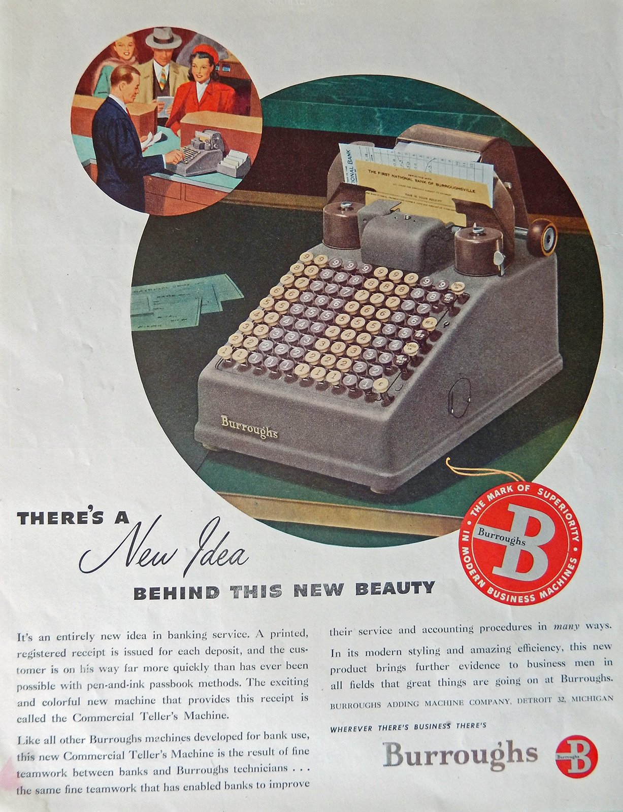 Burroughs, 40's Print Ad. Full Page Color Illustration (Commercial Teller's Mach