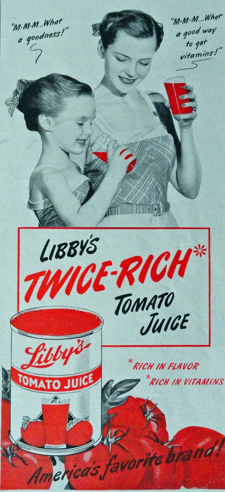 Libby's Tomato Juice, 40's Color print ad. Illustration, painting (mother and da