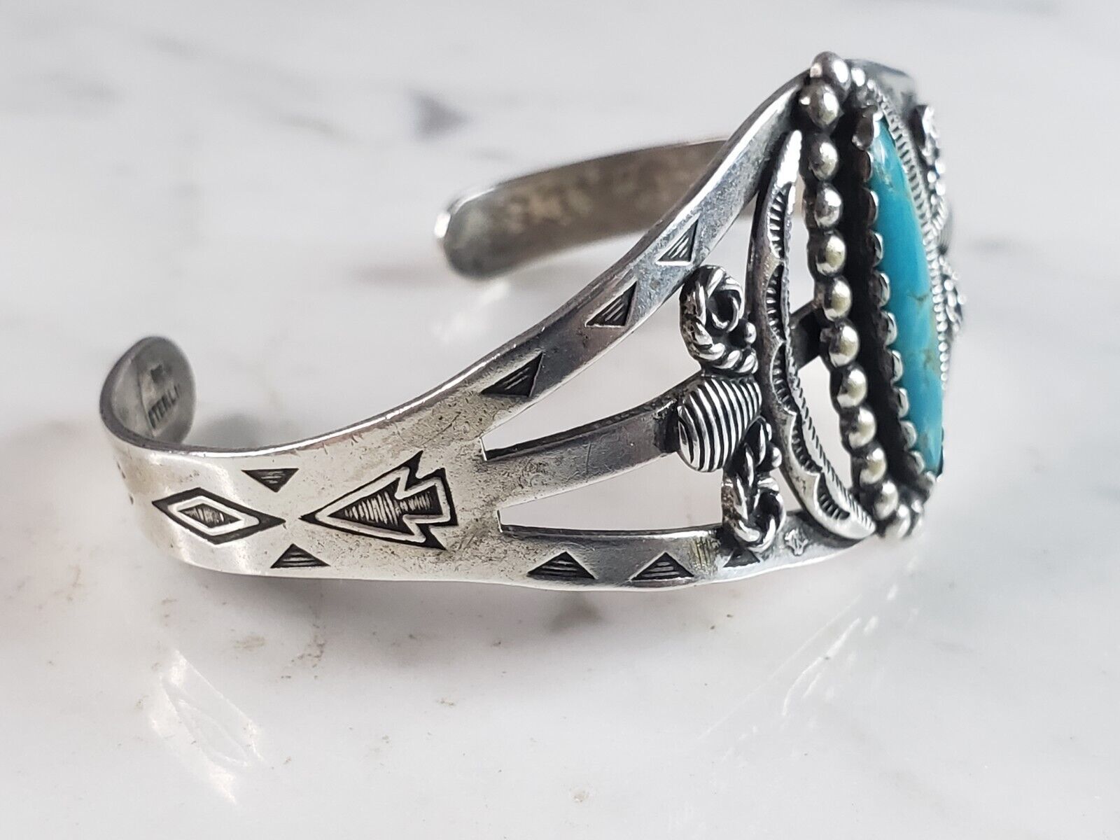 A WOMENS VINTAGE ESTATE .925 STERLING SILVER SOUTHWESTRN TURQUOISE CUFF BRACELET. INSIDE DIAMETER OF THE BRACELET MEASURES 7" . THE WIDTH OF THE FACE IS 1 1/4". BRACELET WEIGHS 20.7g. AS YOU CAN SEE IT IS MARKED STERLING. THIS WOULD MAKE A LOVELY GIFT FOR THAT SOMEONE SPECIAL. ANY QUESTIONS, PLEASE DON'T HESITATE TO ASK. BE SURE TO CHECK OUT SOME OF MY OTHER GREAT ITEMS UP FOR SALE. THANK YOU.