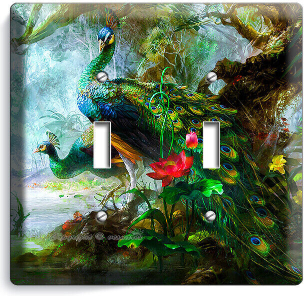 COLORFUL FEATHERS PEACOCKS 2 GANG LIGHT SWITCH WALL PLATE BEDROOM ROOM ART DECOR