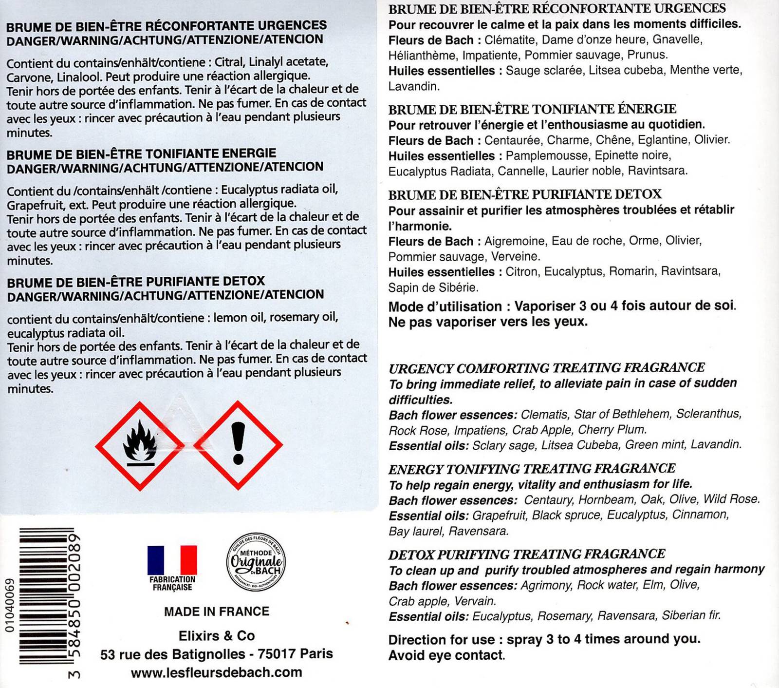 DETOX PURIFYING fragrance to clean up and purify troubled atmospheres and regain harmony. Flower essences: Agrimony, Rock water, Elm, Olive, Crab apple, Vervain. Essential oils: Eucalyptus, Rosemary, Ravensara, Siberian fir.