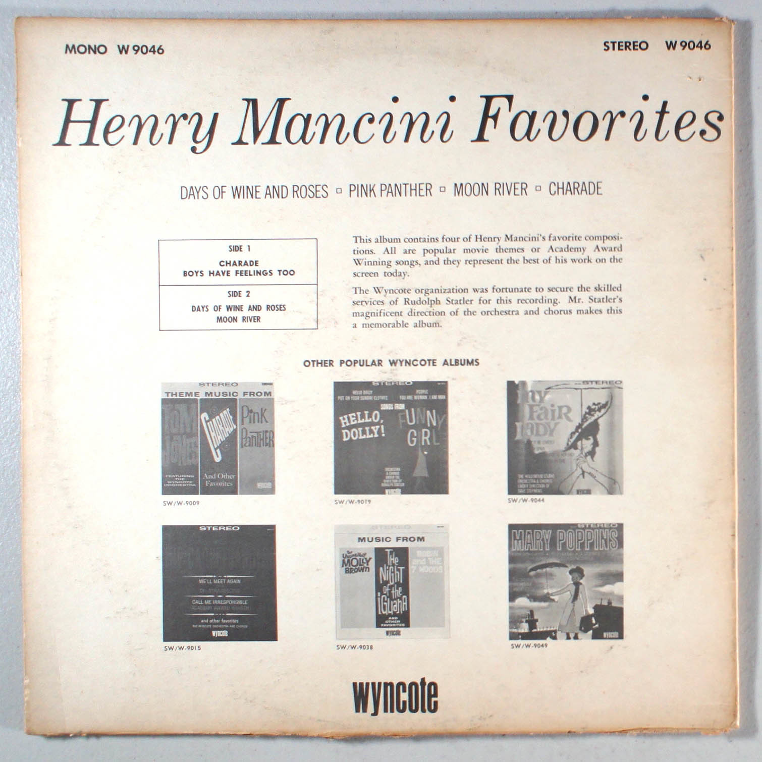 Henry Mancini Favorites, by Rudolph Statler, contains four of Mancini's favorite compositions. All are popular movie themes or Academy Award winning songs, and they represent the best of his work on the screen today. Mr. Statler's magnificent direction of the orchestra and chorus makes this a very memorable album.