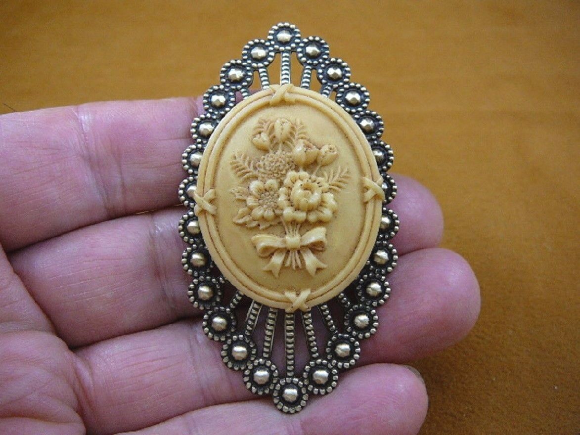(Internal #CM65-5). Excellent, new, hand stained natural pine resin, hand-molded (reproduced from the original shell cameo) cameo of a FLOWER BOUQUET (Tulips, Mums, Daisies; EXCEPTIONAL color and detail). Pin/pendant in ANTIQUE IVORY colored resin, mounted on repro Victorian brass; cameo pin/pendant. Clasp pin/pendant glued on back horizontally.