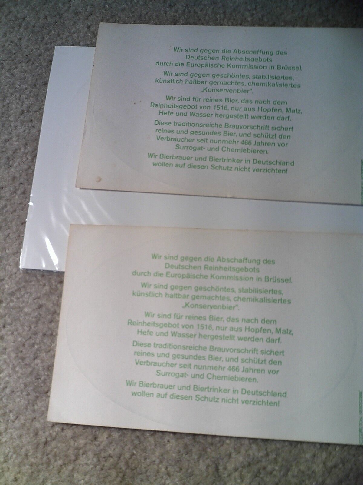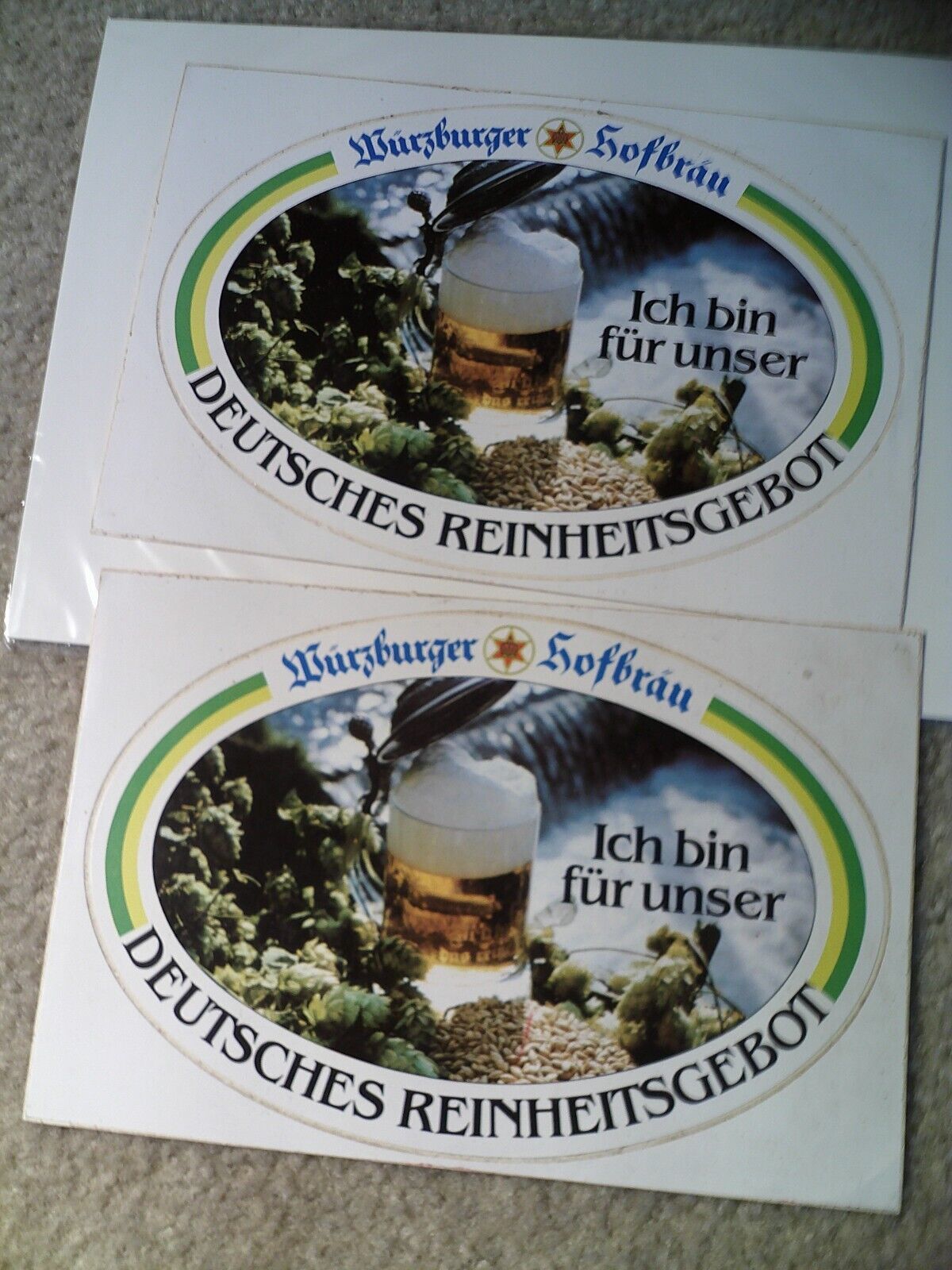 are bidding on a nice, original older, maybe 1970s era, lot of 2 old, larger size German beer stickers, Wurzburger Hofbrau, in the pictures. Each is about 5 inches tall, 7 1/2 inches wide. Very nice shape, very usable old stickers. Zoom in for details.