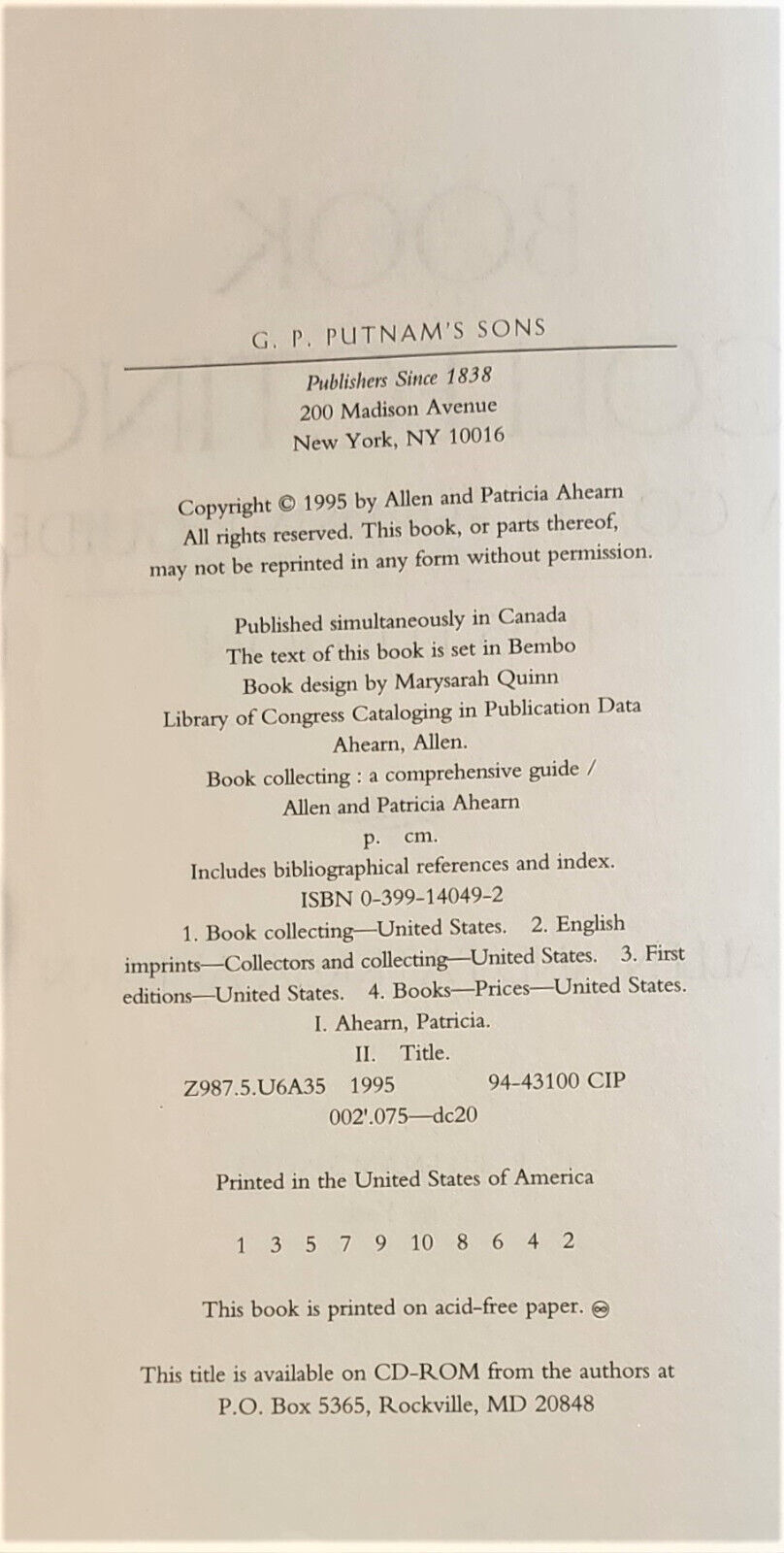 Ahearn, Allen and Patricia, BOOK COLLECTING A COMPREHENSIVE GUIDE 1995 EDITION, New York: G.P. Putnam?s Sons, 1995. 1st/1st OE blue paper / red paper hardcover, 8vo (9 x 6?), Very Good / Fine, 480 pp.