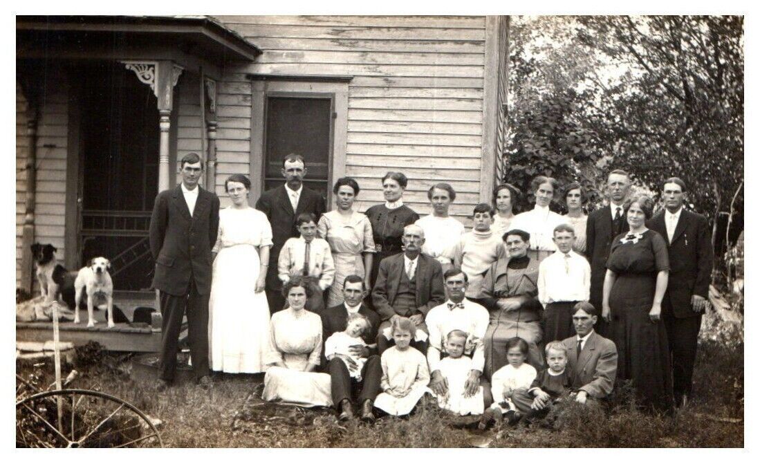 Large Family Photo Outside Old Home w Dogs on Porch RPPC Postcard