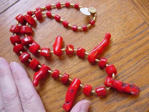 (Internal #V-21) You are bidding on a beautiful, handmade, RED Bamboo CORAL (also known as octocoral) bead necklace. Red coral 1/4 to 1/2" beads and gold brass rice beads, and 5 branches of natural red coral 1-1/8 to 1-3/4" long; necklace is 21" long with gold rhodium safety hook clasp.
