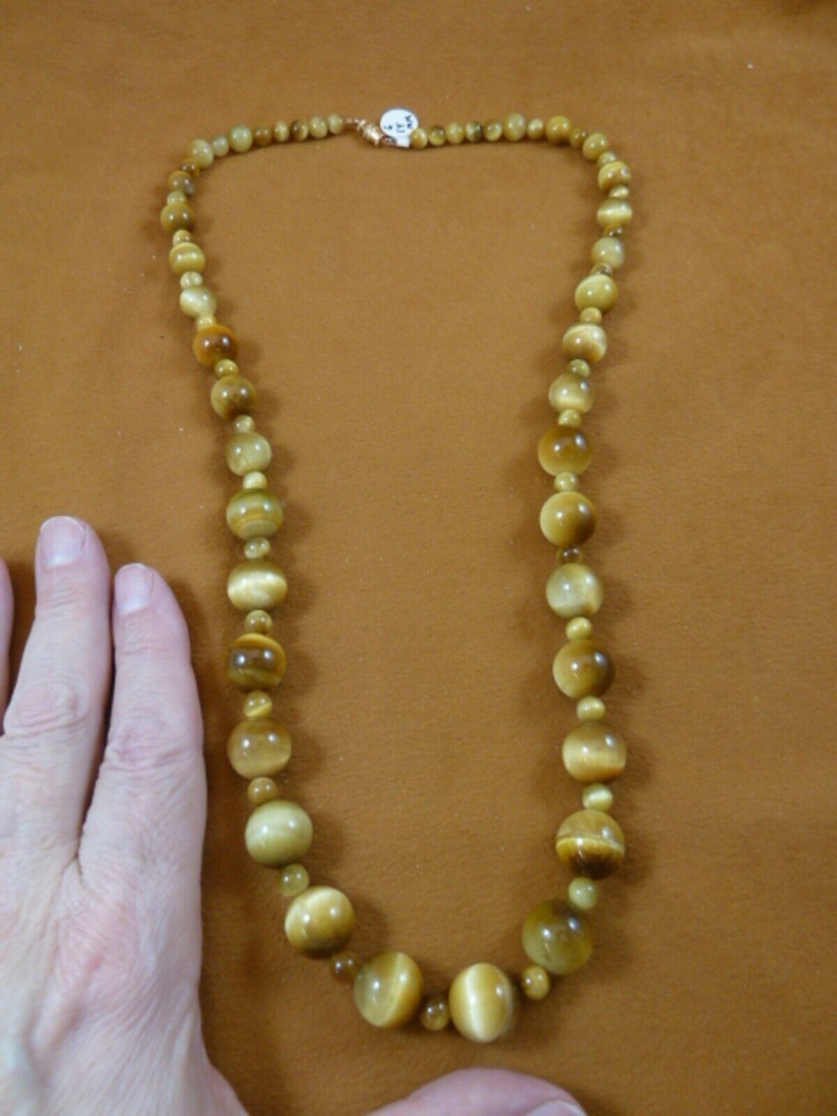 (Internal #V318-17) You are bidding on a beautiful, handmade, blonde tan tiger's eye gemstone beaded necklace 26? long, 6 and 14 mm round beads, gold alloy barrel twist closure.