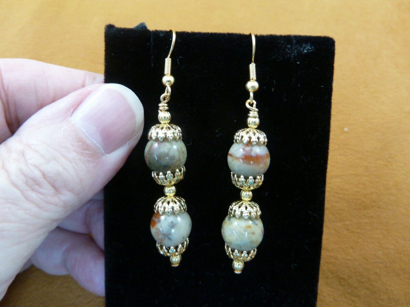 (internal #DP1-41c), This is a beautiful pair of Genuine Dinosaur poop dangle earrings made with two 10 mm beads and gold alloy filigree cap and bead accents, on gold alloy hypoallergenic French wires.