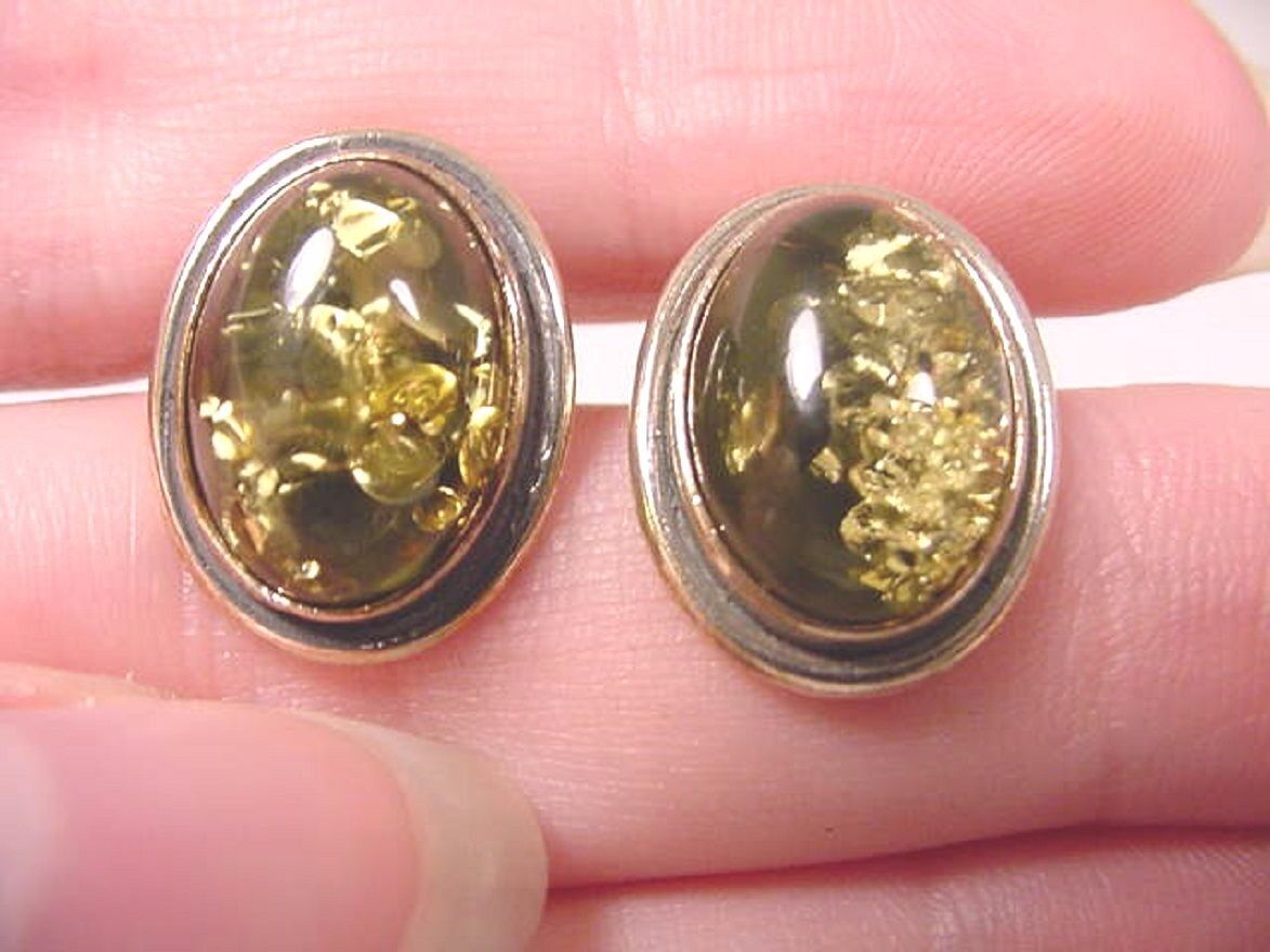 (PE32-2k) Green AMBER oval stone + .925 Sterling SILVER pierced stud EARRINGS