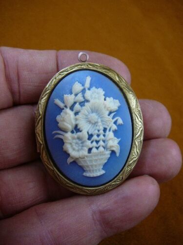 (Internal #CM46-42) SUPERB, new, hand stained natural pine resin, hand-molded (reproduced from the original shell cameo) cameo of a FLOWER BOUQUET in Woven Basket CAMEO, appears to be daisies tulips, top notch detail, you can almost smell them. Cameo in WHITE color with BLUE background, is mounted on vintage brass locket with pendant loop, 1-7/8" long x 1-1/2" wide.