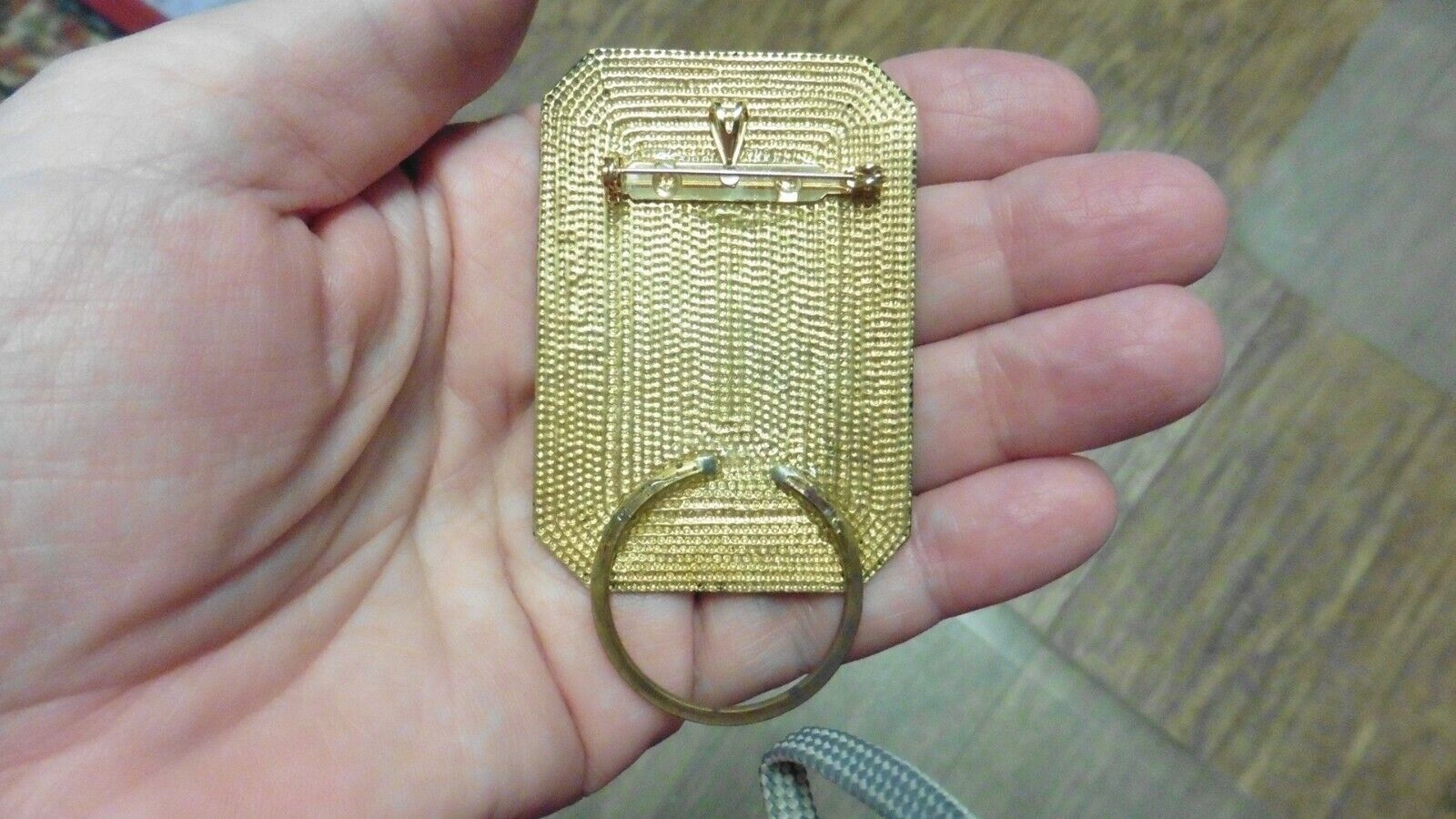 (Internal #E-845) This is piece of repro brass with a pelican bird on a second piece of rectangular shaped brass with textured dot design, made into a pin/pendant brass eyeglass or ID badge holder, 3-1/8" long including the loop. Clasp pin/pendant glued on back horizontally. Excellent detail and texture on the brass.