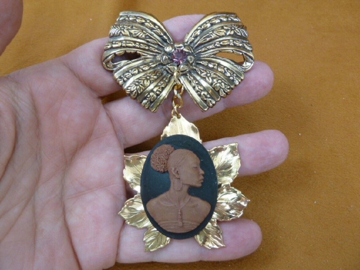 CA20-106) RARE African American LADY black + brown CAMEO bow dangle Pin Pendant