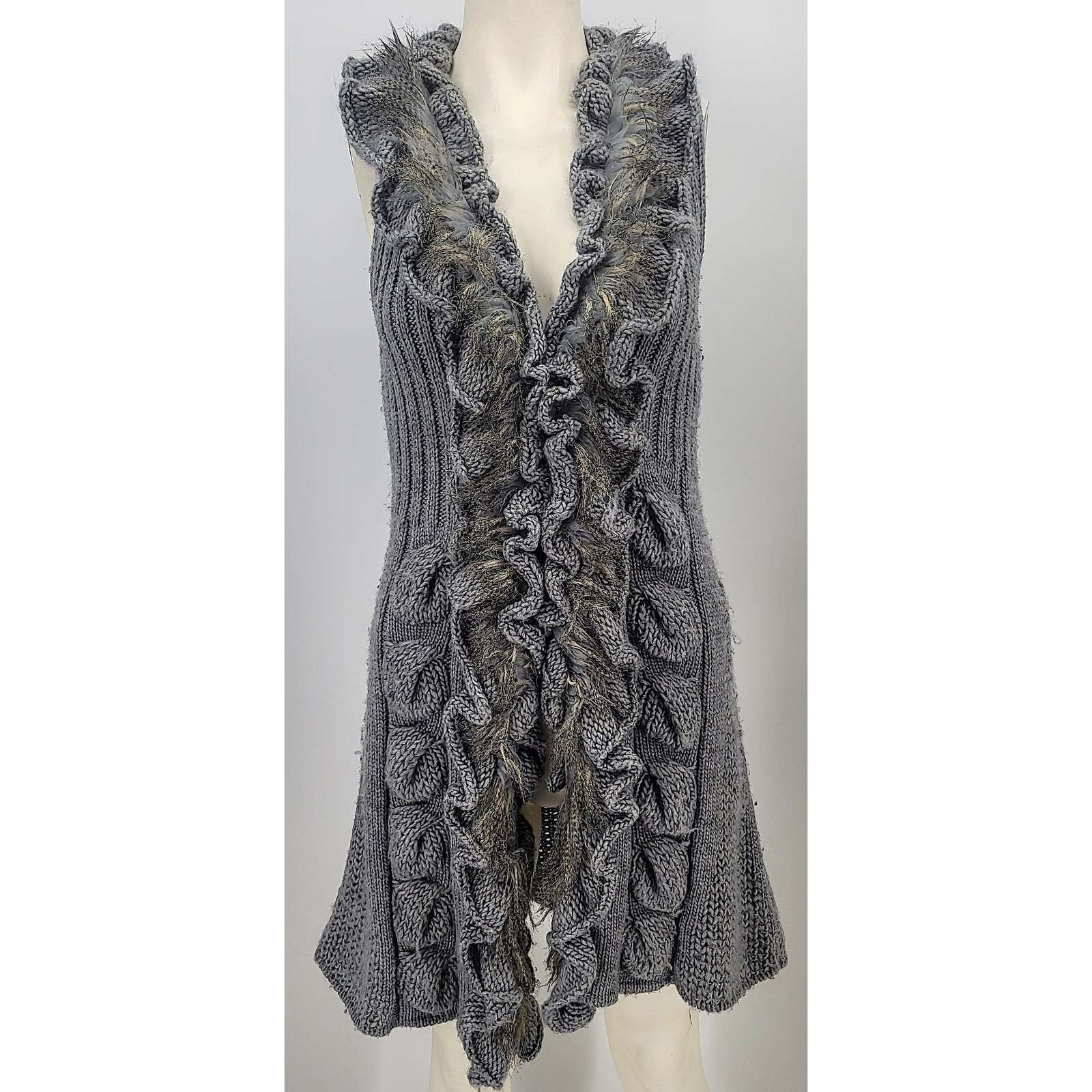Dressbarn Collection , Gray , Faux fur,sweater Knit, long Vest .Womens size Small Ruffles. Wool blend .One hook and eye closure.