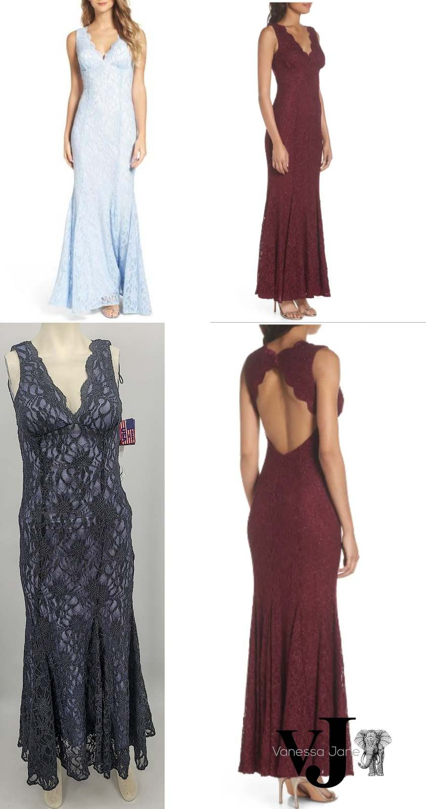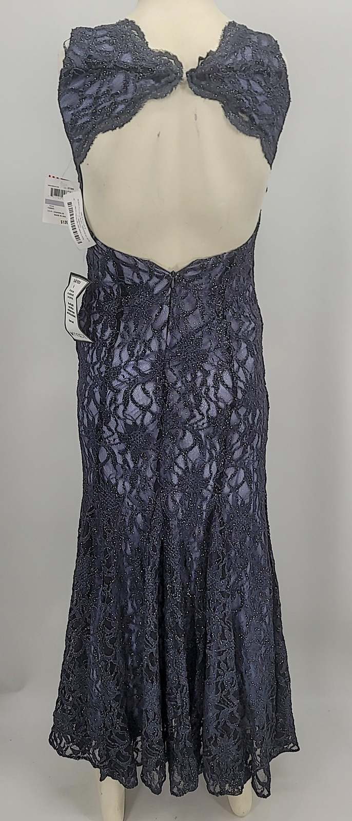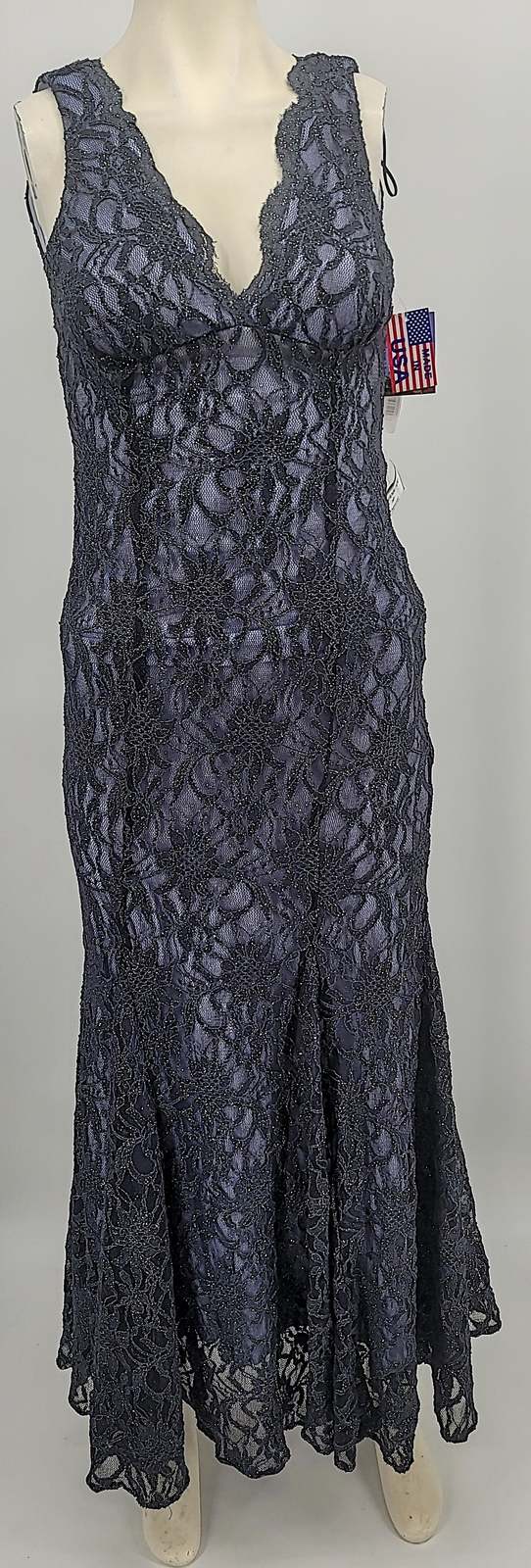 SIZE INFO Unique sizing; see size guide. Juniors to Womens: 1/2=2, 3/4=2-4, 5/6=4, 7/8=4-6, 9/10=6, 11/12=8. DETAILS CARE Make it an evening to remember in this luxe lace gown that flatters your figure with pintucked cups, contoured seams and a flowy mermaid hem. A dusting of glitter swirls around the curve-hugging silhouette for a bit of night magic. 61 1/2 length (size 11/12) Back zip with hook-and-eye keyhole closure V-neck Sleeveless Lined 58% nylon, 40% polyester, 2% spandex Hand wash cold, dry flat Imported Special Occasion Item #5306189