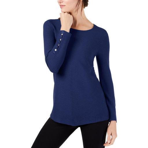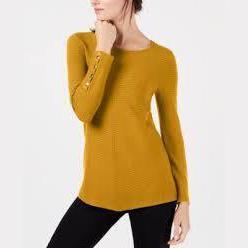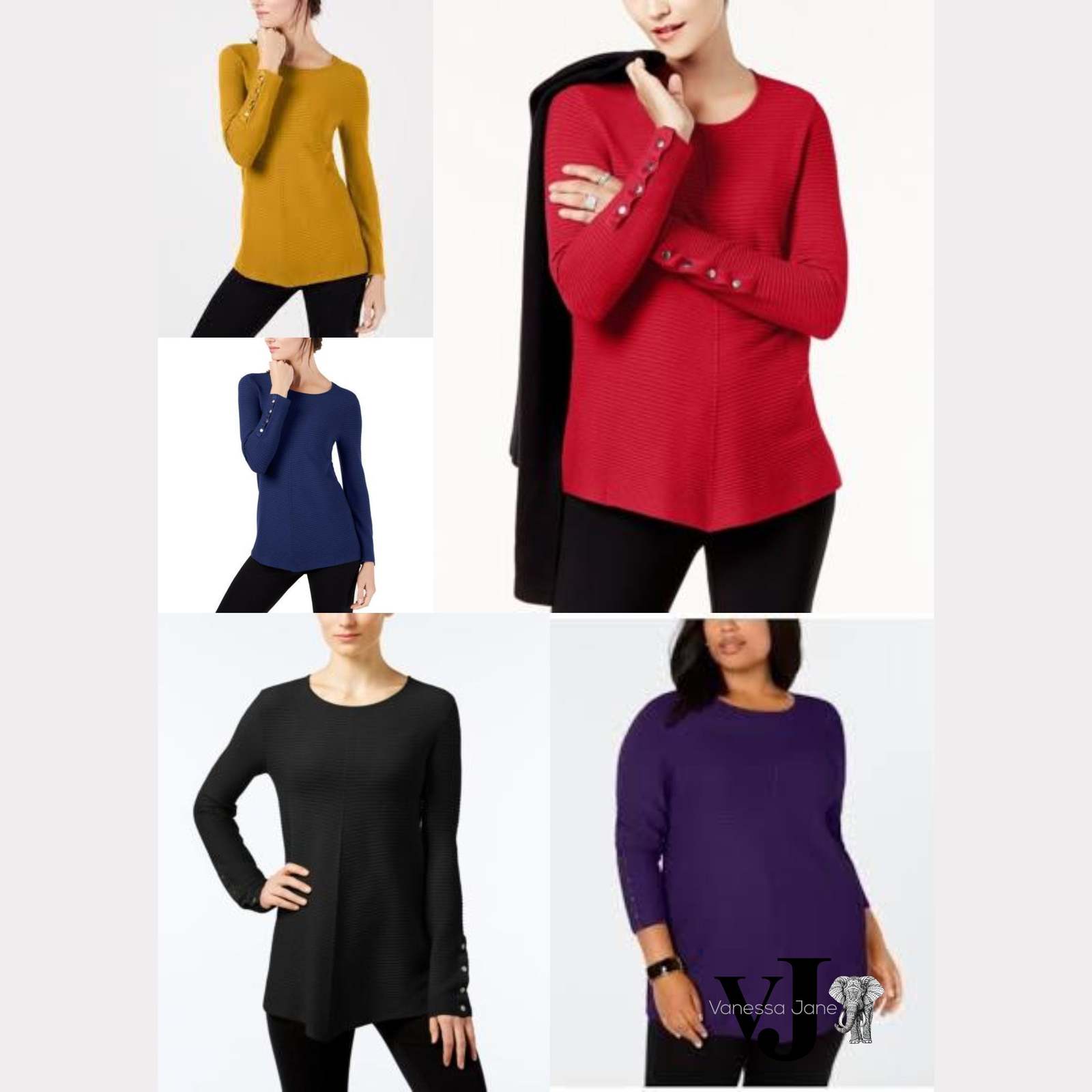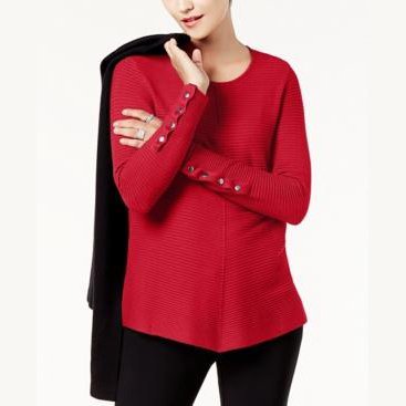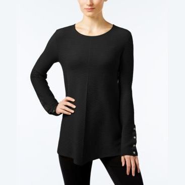 Item Notes: Decorative snaps at the sleeves add hardware-chic style to this ribbed sweater from Alfani. Scoop neckline Approx. model measurements: height: 510; bust: 31-1/2; waist: 24; hips: 35 Ribbed throughout; decorative snaps at sleeves Hits below hip Approx. model height is 510 and she is wearing a size S/4 Rayon/nylon Machine wash Imported