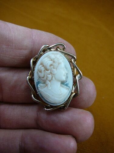 (internal #CS95-1) This is a new, pine resin cameo has been hand molded from the shell original, SERENE WOMAN CAMEO pin, woman is Straight-backed, forward looking, a strong and beautiful woman, in WHITE color with BLUE-GREEN accent color, cameo itself is 1" long x 3/4" wide then mounted on vintage setting, silver tone chain style outer design, gold tone inner wrap, original clasp pin on back.
