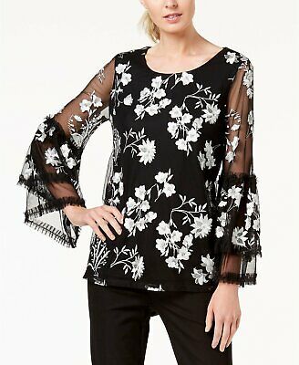 Alfani Embroidered Sheer-Sleeve Top, Black/Gray Size Small