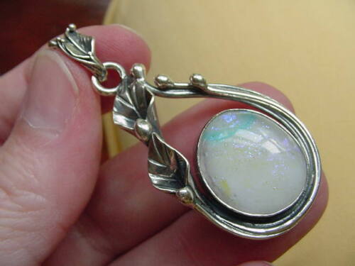 Dichroic glass is glass with precious metals such as gold, silver, copper, aluminum, titanium, and/or chromium etc. fused into it. It has a GEMSTONE status though manmade. Sterling silver mounting is custom made for us in Poland with the lily and grape leaf designs that are STUNNING. "Dichroic" means "two colors" and indeed when the pendant moves it changes color so it goes with EVERYTHING in your wardrobe.