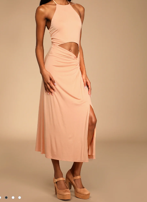 Lulus Top of the Trends Peach Twist-Front Cutout Halter Midi Dress, Size Large