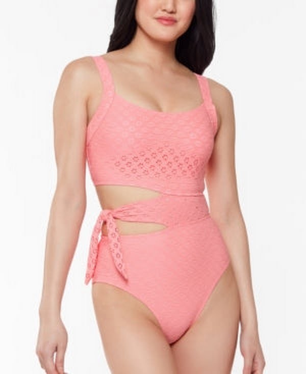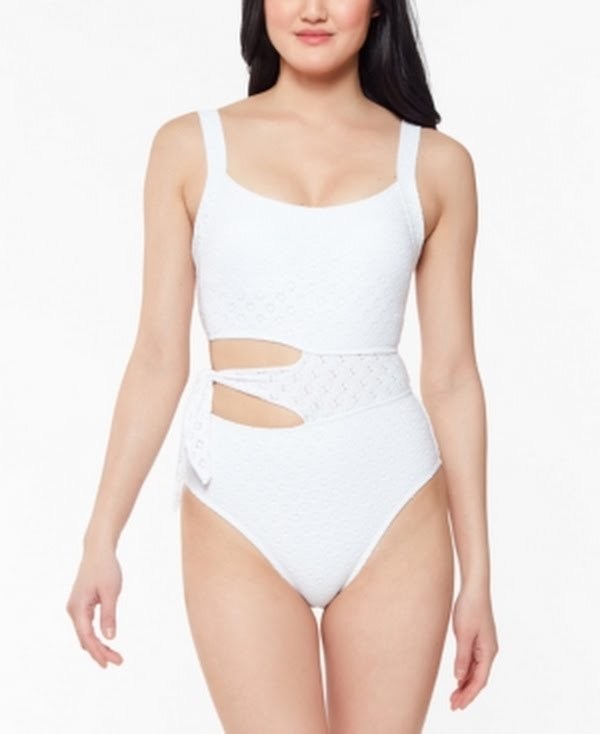 JESSICA SIMPSON Womens Swimwear Solid Bralette. Features: Dare to bare more in this playful one-piece swimsuit from Jessica Simpson designed with two side cutouts. Lined. Pull-on styling; adjustable straps. Full bottom coverage. Removable cups. Scoop neckline; cutouts and tie at side. Style #: SSST21822 87% Polyester, 13% Spandex Imported