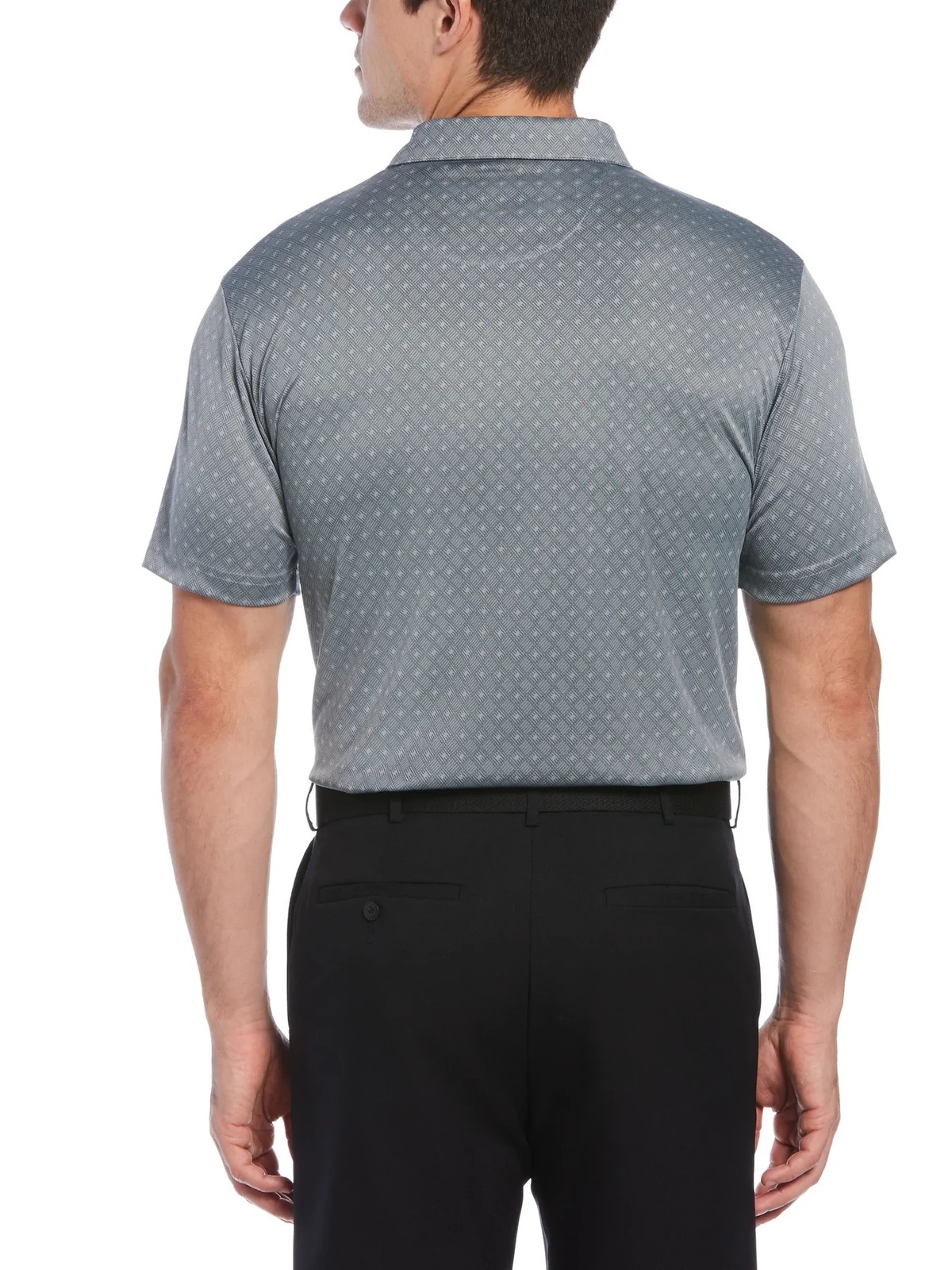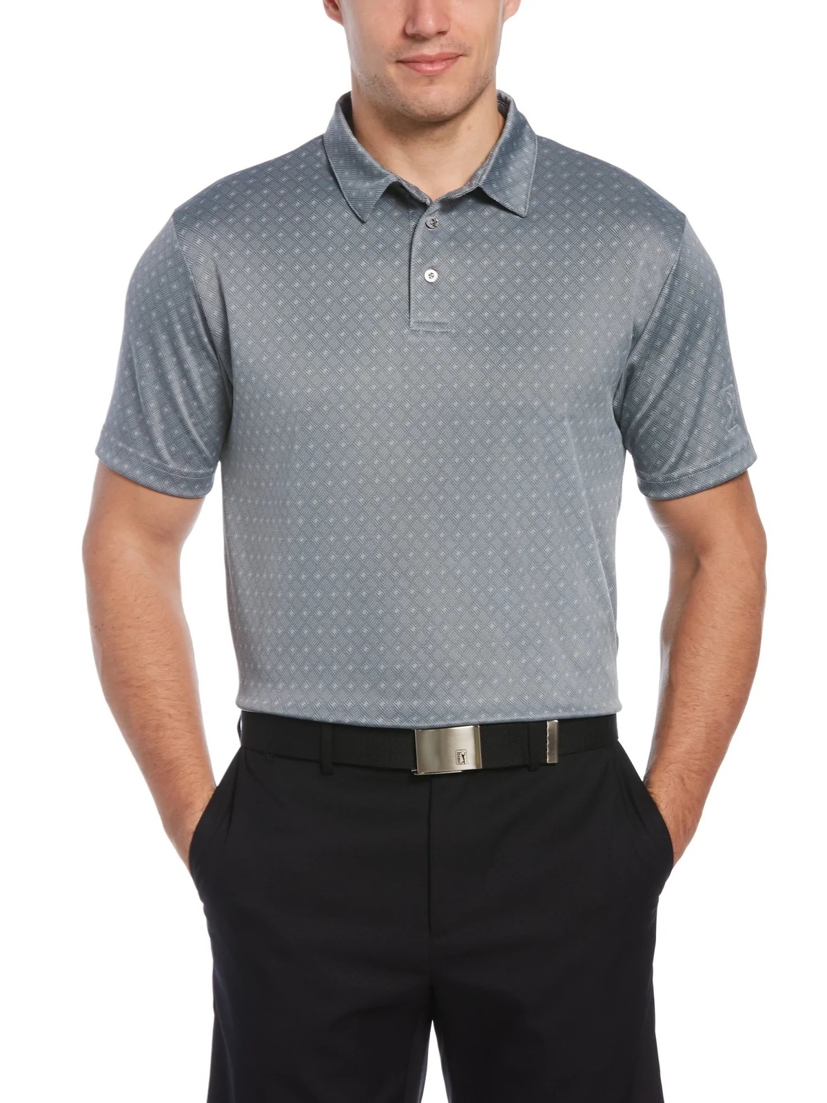 Look and feel your best on the links in this PGA TOUR golf polo. Double knit fabric provides a thicker feel and lasting durability. Jacquard fabrication imparts slight texture and a subtle diamond pattern. Classic polo details give the mens golf shirt a polished finish that keeps you prepared for life on the go. 100% Polyester Double knit fabrication joins together two layers of fabric for extra thickness Easy Care Moisture Wicking Sun Protection Stretch Shoulder Seams Self Collar Short Sleeve Machine Wash Imported