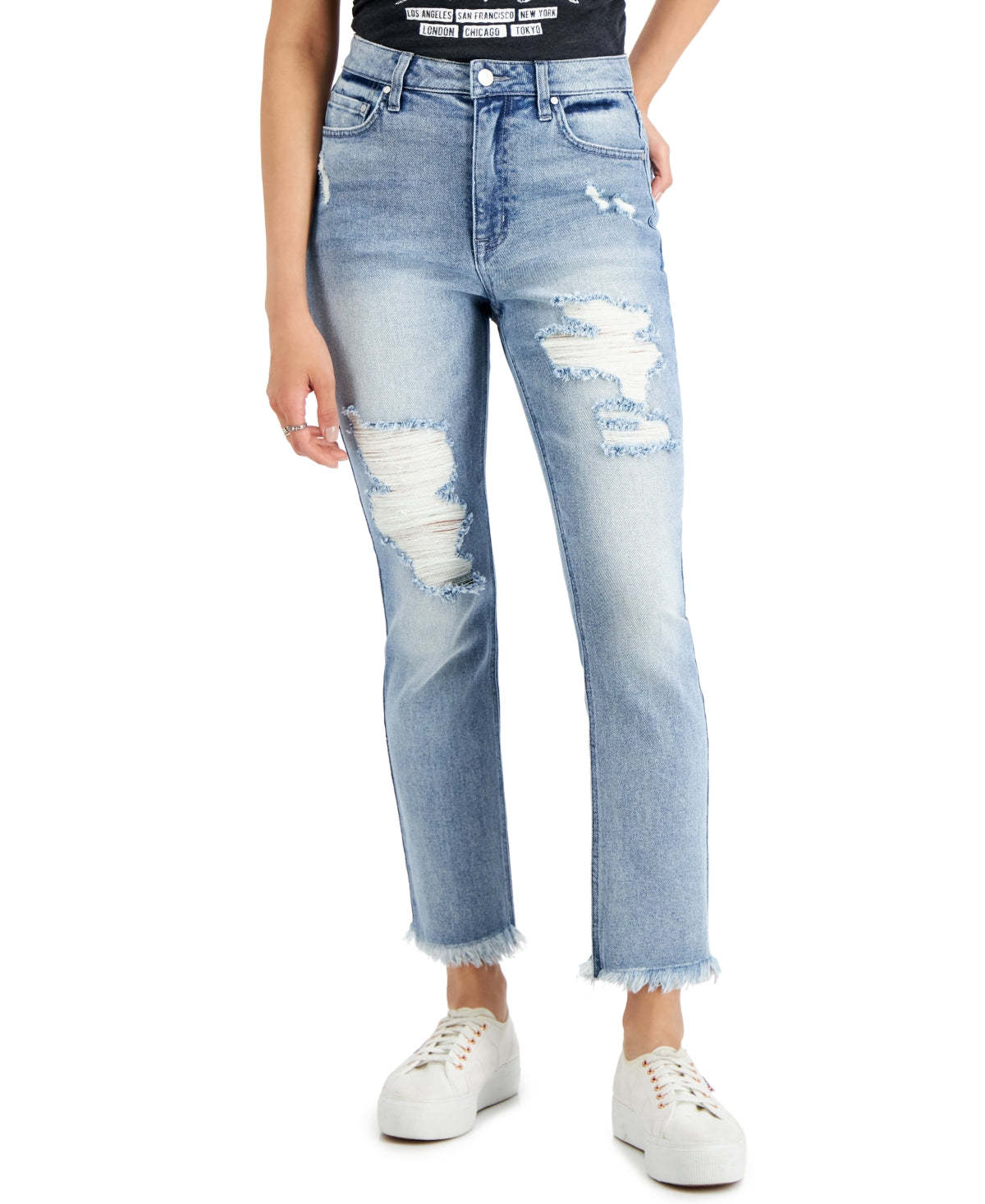Tinseltown has your denim style covered with these straight-leg jeans designed with a super flattering high rise and tons of rips. Size Fit Approx. inseam: 27-1/2 Front rise: approx. 13; leg opening: 12 Materials Care Machine washable Cotton/spandex