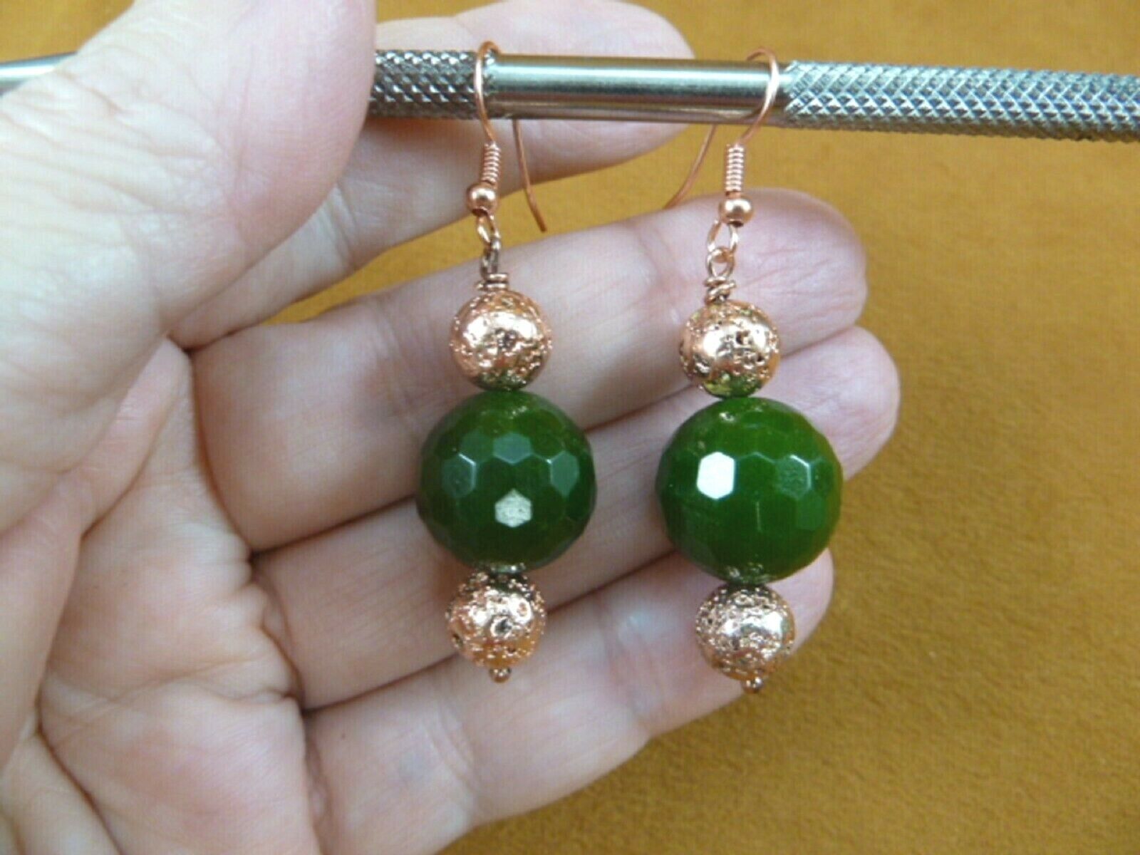 (ee406-3) round faceted 16mm green Jade gemstone bead + copper dangle earrings
