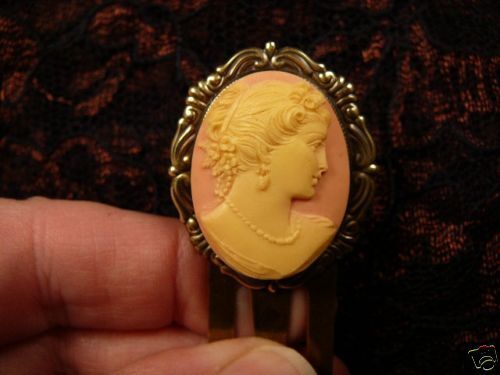 Mounted on a piece of reproduction Victorian brass, then glued on a brass bookmark; item is 2-7/8" long x 1-3/16" wide. Superb detail for a small cameo. I know because we do half the work in creating the cameos. A great collectible or gift to display or use! Comes with information card.