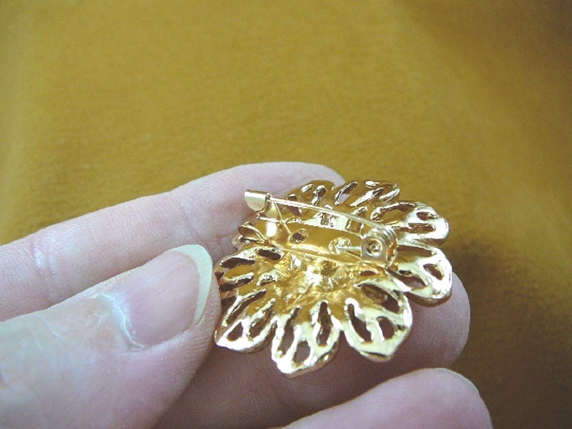 (Internal #BB601-42) This is a beautiful gold (alloy) tone, ornate filigree scrolled flower floral design pin with two shades of blue rhinestone crystal accents, average 1-1/4 to 1-1/2" diameter. Hook style pin on back, see photo.
