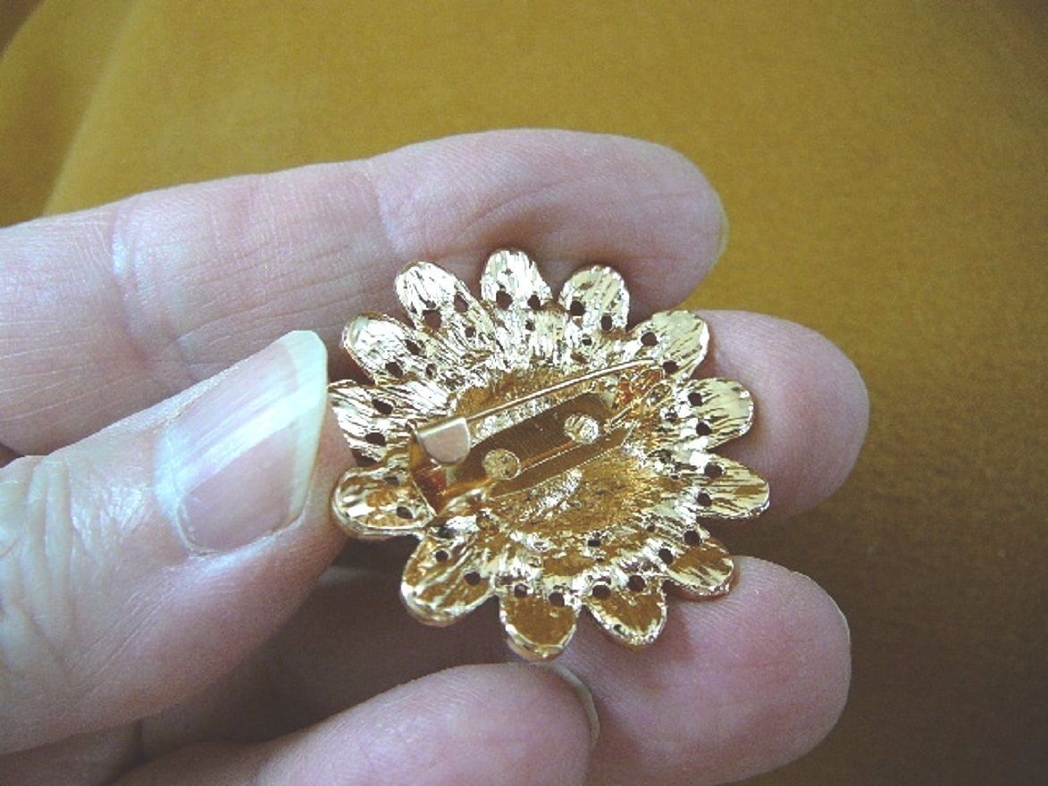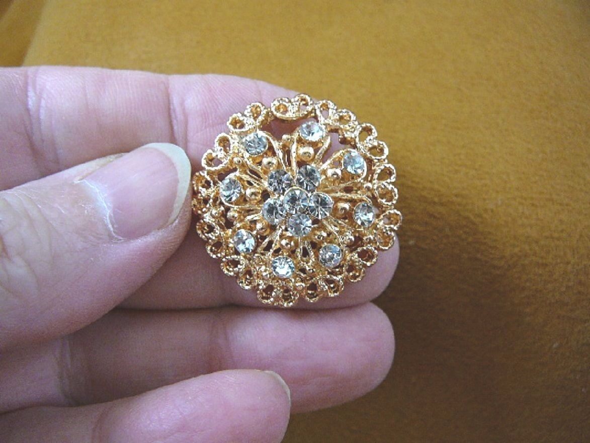 (Internal #BB604-20) This is a beautiful gold (alloy) tone, ornate scrolled daisy flower design pin with clear white rhinestone crystal accents, average 1-1/4 to 1-1/2" diameter. Hook style pin on back, see photo for example.
