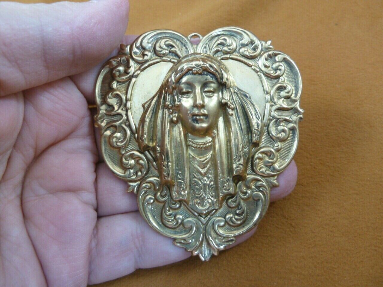 (Internal #B-WOM-45-4) This is a beautiful pin/pendant (glued on the back) made of s piece of Victorian brass of a Mysterious woman in veil, on a second piece of heart shaped brass with scrolled design, 3? long x 2-3/4? wide. This gorgeous reproduction Victorian stamped brass is antiqued, then buffed to create some shine. ?BRASS IS A GOLD COLOR?.