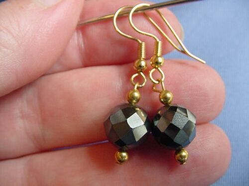 (Internal #EE-369) You are bidding on this pair of one bead, larger faceted 8mm HEMATITE (Iron Oxide, a heavy gemstone they called Black Diamond) DANGLE EARRINGS with gold tone bead accents, on gold tone French wire earrings.