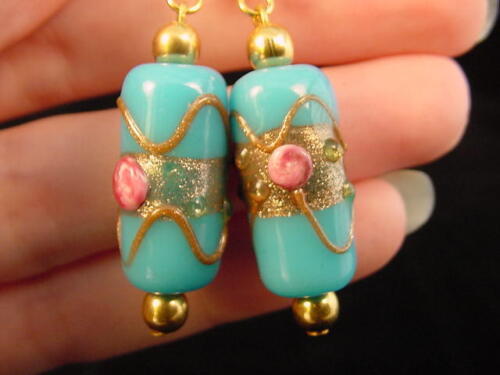 (Internal #EE-504-62) This is a beautiful pair of LIGHT BLUE with copper colored stripes and pink rose flower and clear yellow dots, one bead dangle earrings with gold tone bead accents, on gold tone hypoallergenic french wires. Earrings are 2" long x 7/16" wide. This pair a earrings are nice, for a classic look.