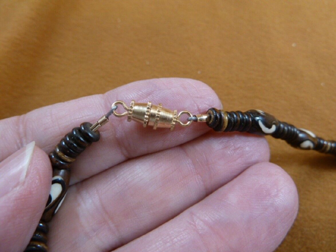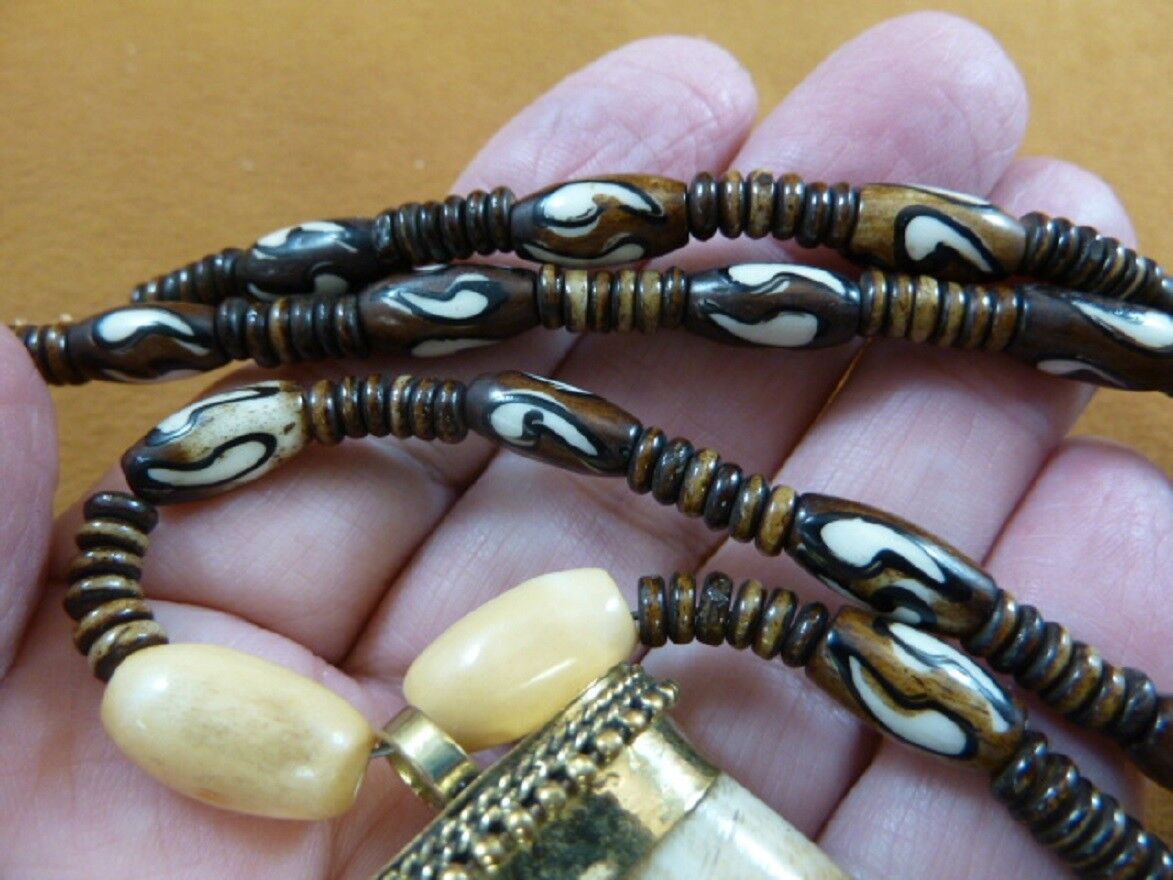 (Internal #V640-3) You are bidding on a beautiful, handmade, beaded necklace with ?comma? brown black white cow bone beads rice shaped, (12x6 mm); brown cow bone rondell beads (5x2 mm); two barrel natural cow bone beads above pendant (15x8 mm), gold barrel twist closure.