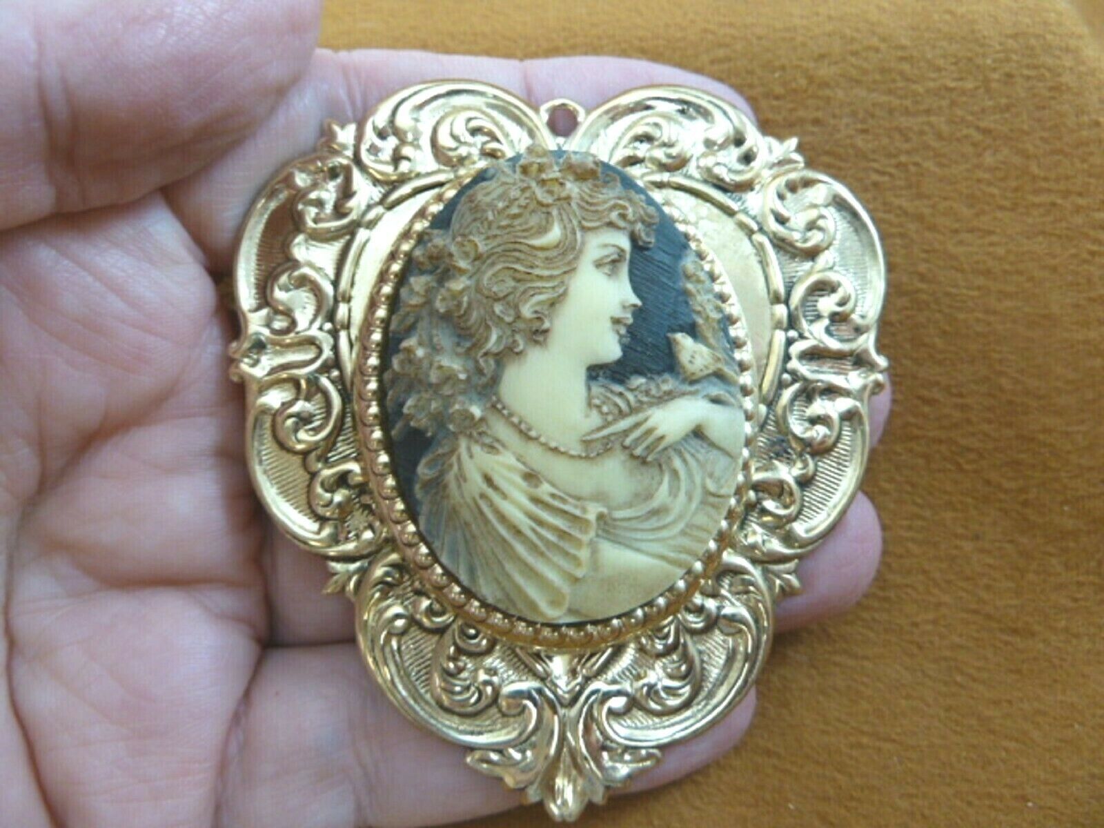 (CL17-13) Lacy LADY woman BIRD black + ivory CAMEO scrolled Pin Jewelry brooch