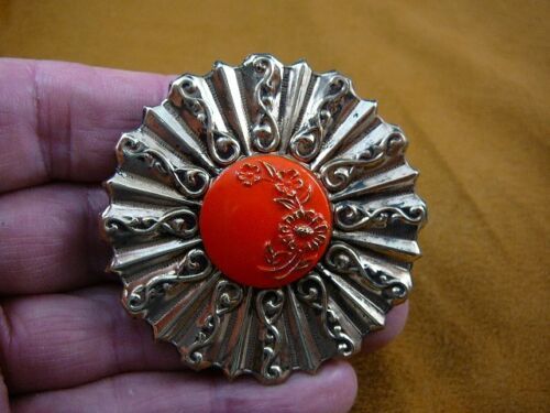 (Internal #Z22-14) This is a beautiful pin (glued on the back) made of red with textured gold daisy flower design, vintage 1940's Czech glass button, on a piece of round Victorian brass with textured swirl art deco design, 2-1/4" diameter. This gorgeous reproduction Victorian stamped brass is antiqued, then buffed to create some shine. ?BRASS IS A GOLD COLOR?.