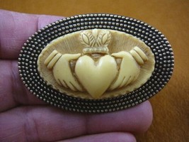 (internal #CM38-36) You are bidding on a lovely cameo of an IRISH CLADDAGH (two hands holding between them, or presenting, a HEART. Over the heart is a crown or fleur-de-lis. The symbols mean Let Love and Friendship Reign. The original expression is: "With These Hands I Give you my Heart and Crown it with my Love"). Cameo itself measures 1-3/4" wide x 1" long; new, organic pine resin cameo has been hand molded from the shell original in IVORY color, antiqued, then mounted on oval repro Victorian brass with textured dot design; clasp pin/pendant glued horizontally on back. This is exactly the cameo you would receive.