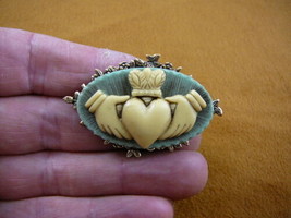 (internal #CM38-77) You are bidding on a lovely cameo of an IRISH CLADDAGH (two hands holding between them, or presenting, a HEART. Over the heart is a crown or fleur-de-lis. The symbols mean Let Love and Friendship Reign. The original expression is: "With These Hands I Give you my Heart and Crown it with my Love"). Cameo itself measures 1-3/4" wide x 1" long; new, organic pine resin cameo has been hand molded from the shell original in IVORY color with MEDIUM BLUE background color, antiqued, then mounted on repro Victorian brass with flower design; clasp pin/pendant glued horizontally on back. This is exactly the cameo you would receive.